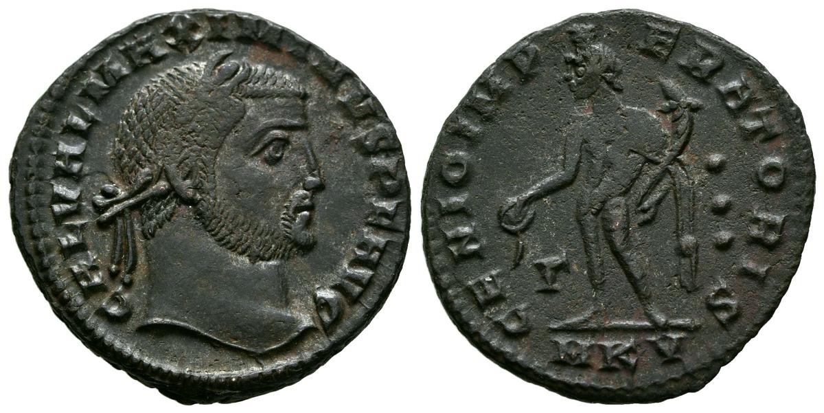 MAXIMIANO II. Follis. (Ae. 5,25g/24mm). 311 d.C. Cícico. (RIC 70). Anv: Cabeza laureada de Maximiano II a derecha, alrededor leyenda: GAL VAL MAXIMINVS P F AVG. Rev: Genio estante a izquierda portando patera y cornucopia, en campo r y tres puntos, en exergo: MKV, alrededor leyenda: GENIO IMPERATORIS. MBC-.