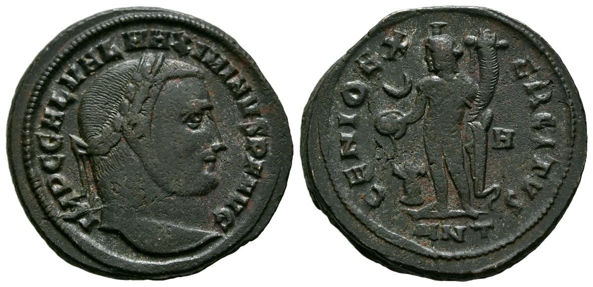 MAXIMIANO II. Follis. (A. 6,87g/24mm). 310-311 d.C. Antioquía. (RIC 147). Anv: Busto laureado de Maximino II a derecha, alrededor leyenda: IMP C GAL VAL MAXIMINVS P F AVG. Rev: Genio estante a izquierda portando globo sobre altar y cornucopia, en campo creciente y H, en exergo: ANT, alrededor leyenda: GENIO EXERCITVS. MBC.