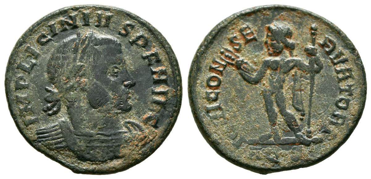 LICINIO I. Nummus. (Ae. 3,21g/20mm). 317 d.C. Aquileia. (RIC 6). Anv: Busto laureado y con coraza de Licinio I a derecha, alrededor leyenda: IMP LICINIVS P F AVG. Rev: Júpiter estante a izquierda portando rayo y cetro, en exergo: AQS, alrededor leyenda: IOVI CONSERVATORI. MBC.