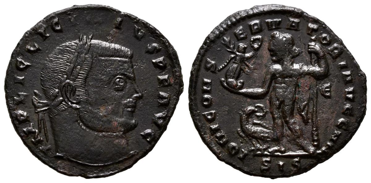LICINIO I. Follis. (Ae. 3,01g/22mm). 313-315 d.C. Siscia. (RIC 7). Anv: Cabeza laureada de Licinio I a dercha, alrededor leyenda: IMP LIC LICINIVS P F AVG. Rev: Júìter estante a izquierda portando cetro y Victoria con corona de laurel, en exergo: SIS, en campo E, alrededor leyenda: IOVI CONSERVATORI. MBC.