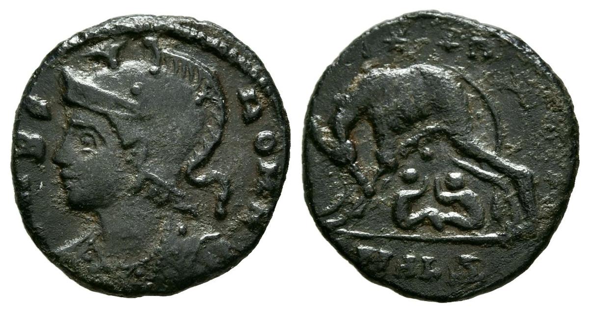 CONSTANTINO I. Follis. (Ae. 1,41g/15mm). 333-335 d.C. Alejandría. (RIC 63). Anv: Busto con casco y coraza de Roma a izquierda, alrededor leyenda: VRBS ROMA. Rev: Loba a izquierda alimentando a Rómulo y Remo, en exergo: SMALA. MBC.