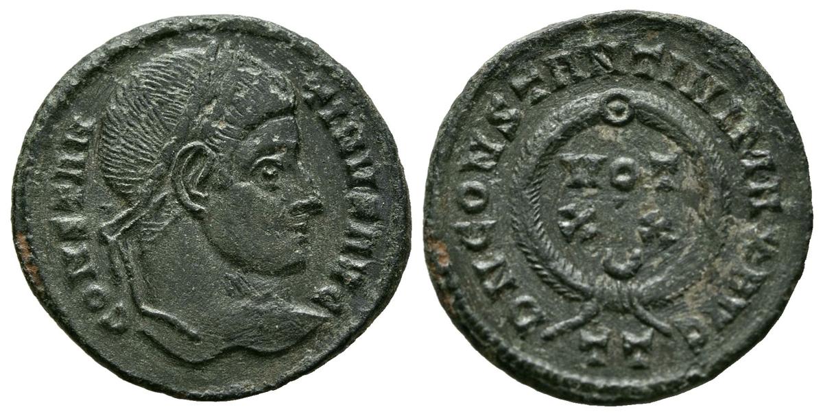 CONSTANTINO I. Follis. (Ae. 2,69g/19mm). 322-325 d.C. Ticinum. (RIC 140). Anv: Cabeza laureada de Constantino I a derecha, alrededor leyenda: CONSTANTINVS AVG. Rev: Leyenda: VOT/XX, dentro de corona de laurel, debajo: TT, alrededor leyenda: D N CONSTANTINI MAX AVG. MBC+.