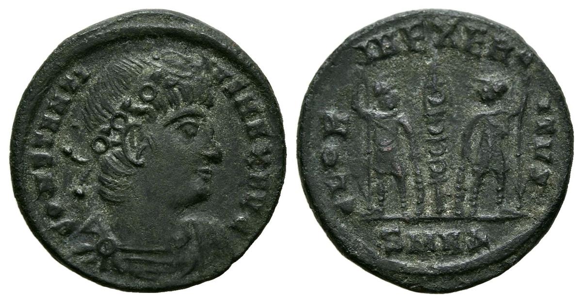 CONSTANTINO I. Follis. (Ae. 1,84g/16mm). 337 d.C. Alexandría. (RIC 188). Anv: Busto diademado y drapeado de Constantino I a derecha, alrededor leyenda: CONSTANTINVS MAX AVG. Rev: Dos soldados estante portando lanza y escudo enfrentados , entre ellos dos estandartes, en exergo: SMNA, alrededor leyenda: GLORIA EXERCITVS. MBC.