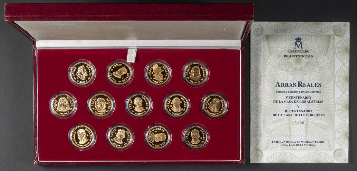 ESPAÑA. La Casa de Borbón, Tres Siglos de Historia de España. Colección de 25 sellos en plata de 0.925 milésimas y bañados en oro. Peso total del conjunto: 724,50g. Incluye estuche original con llave y paño de joyero. Realizado por Hallmark Replicas Ltd. Magnífico estado de conservación. A EXAMINAR.