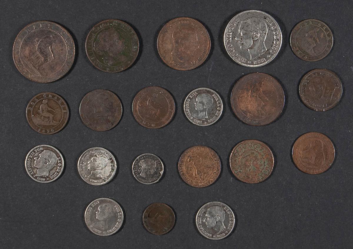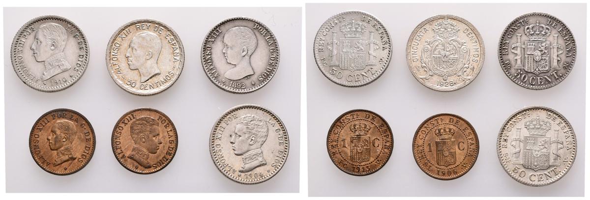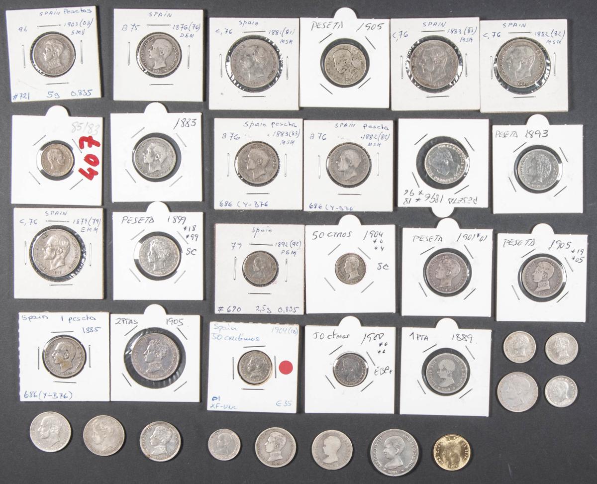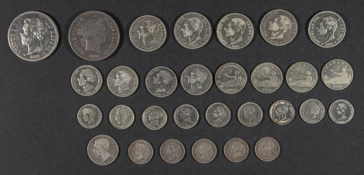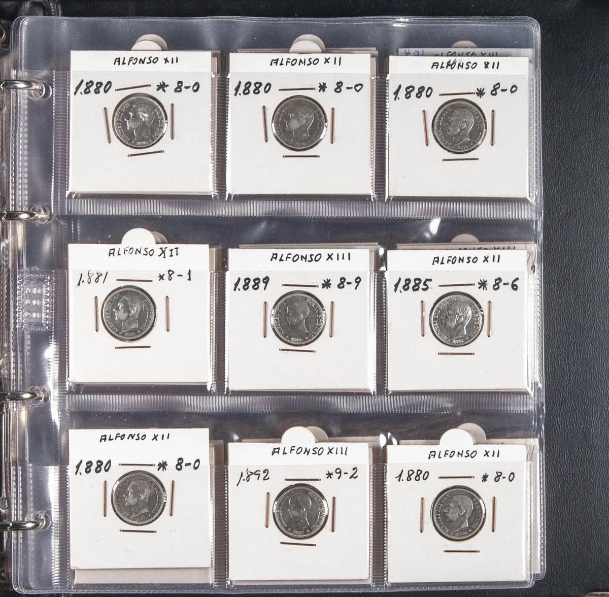 CENTENARIO DE LA PESETA. Precioso conjunto de 34 piezas de módulos de 50 Céntimos, 1 y 2 Pesetas acuñadas en los reinados de Alfonso XII y XIII. Gran variedad de fechas, algunas escasas y alguna sobrefecha, y diversos estados de conservación con piezas en alta graduación. Incluye varias piezas del módulo de 1 Peseta en estado SC- o SC (1896, 1899, 1901 o 1903) y la Peseta de 1975 variante punto sobre ñ en SC. A EXAMINAR
