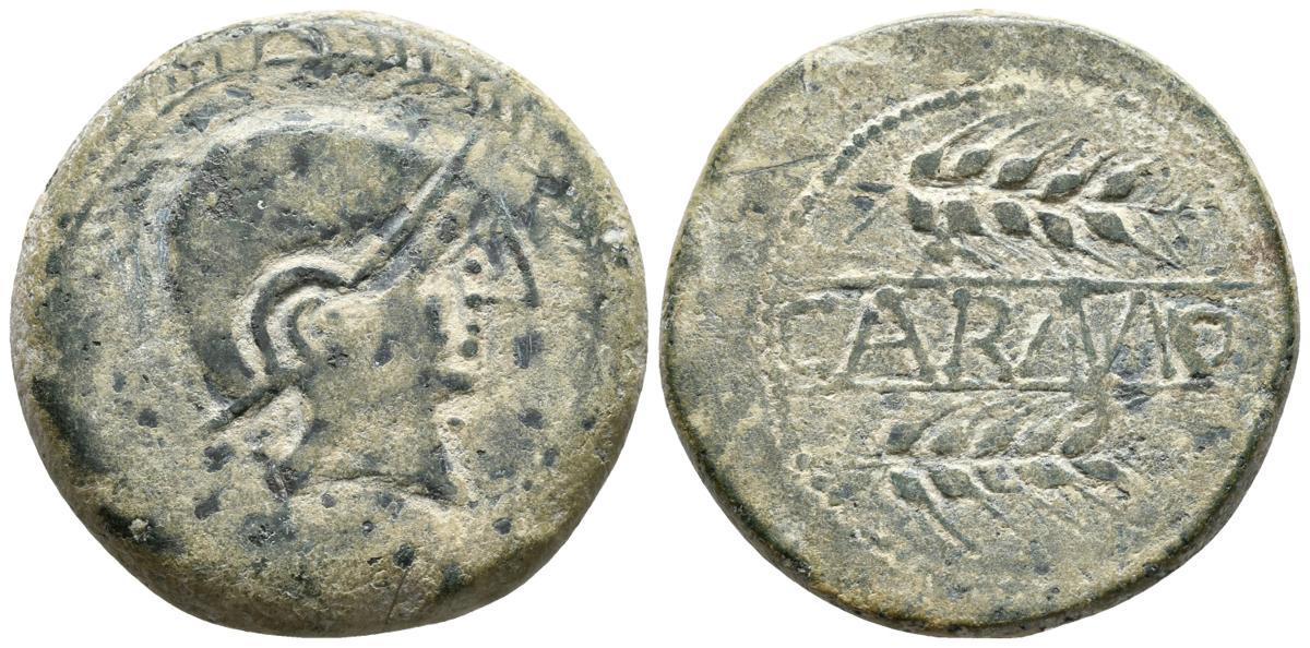 CARMO. As. 80 a.C. Carmona (Sevilla) A/ Cabeza masculina a derecha, con casco dentro de láurea. R/ CARMO entre dos espigas a derecha. FAB-454. Ae. 22,54g. MBC.
