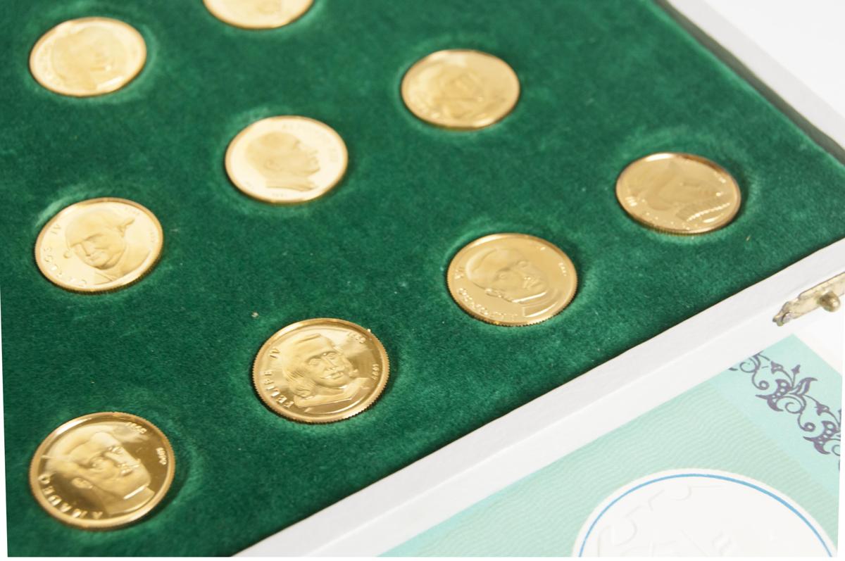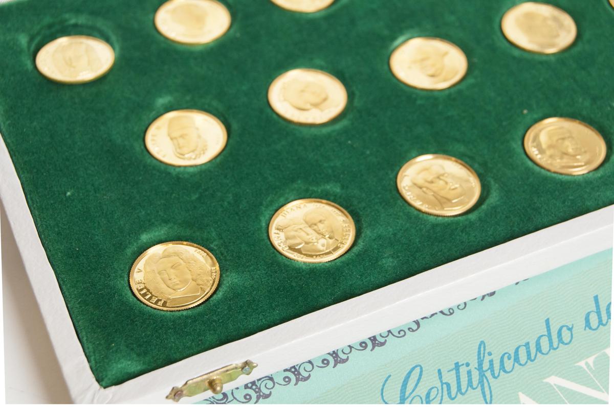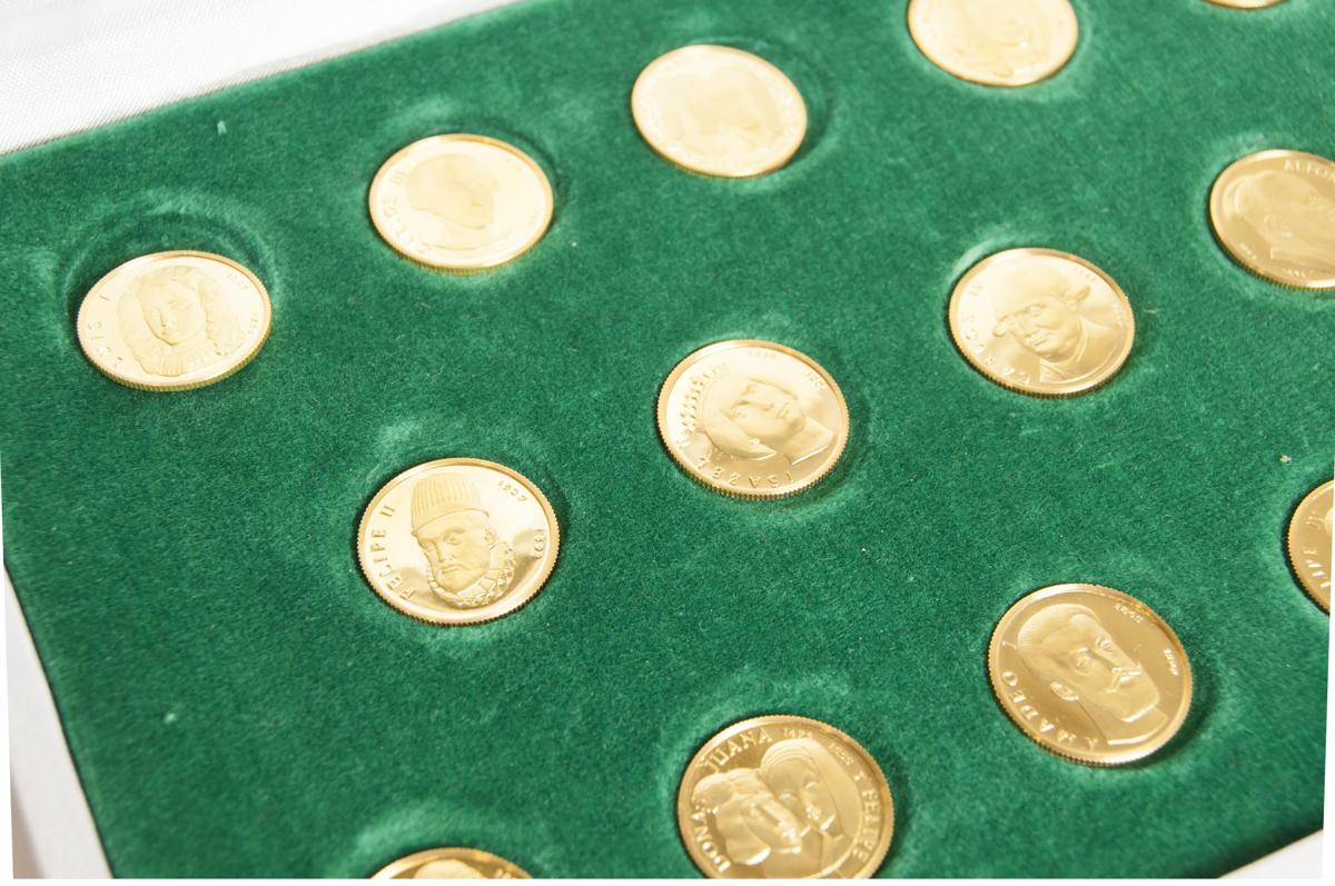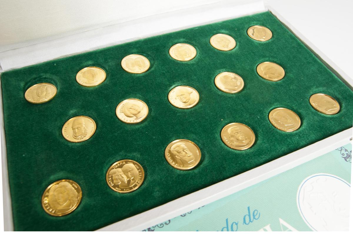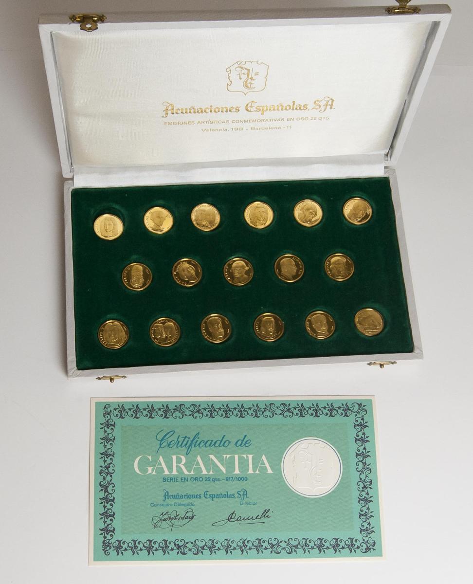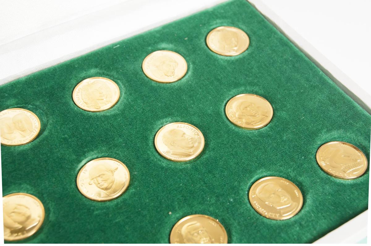 MONARQUIA ESPAÑOLA. Colección de 17 medallas con la efigie de todos los monarcas españoles y su escudo en reverso. Au. Peso total del conjunto 68,00g. Presentado en estuche oficial con certificado. SC.