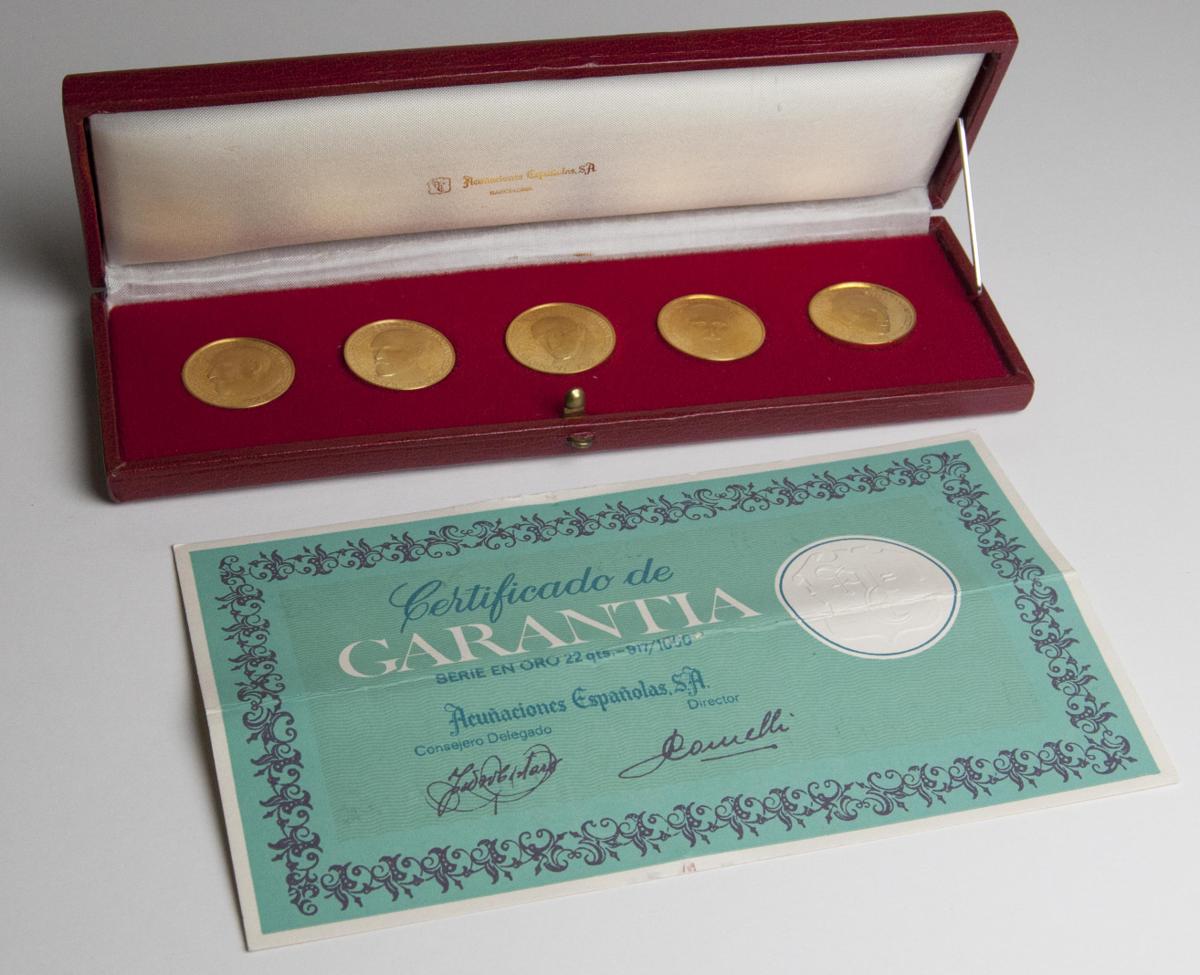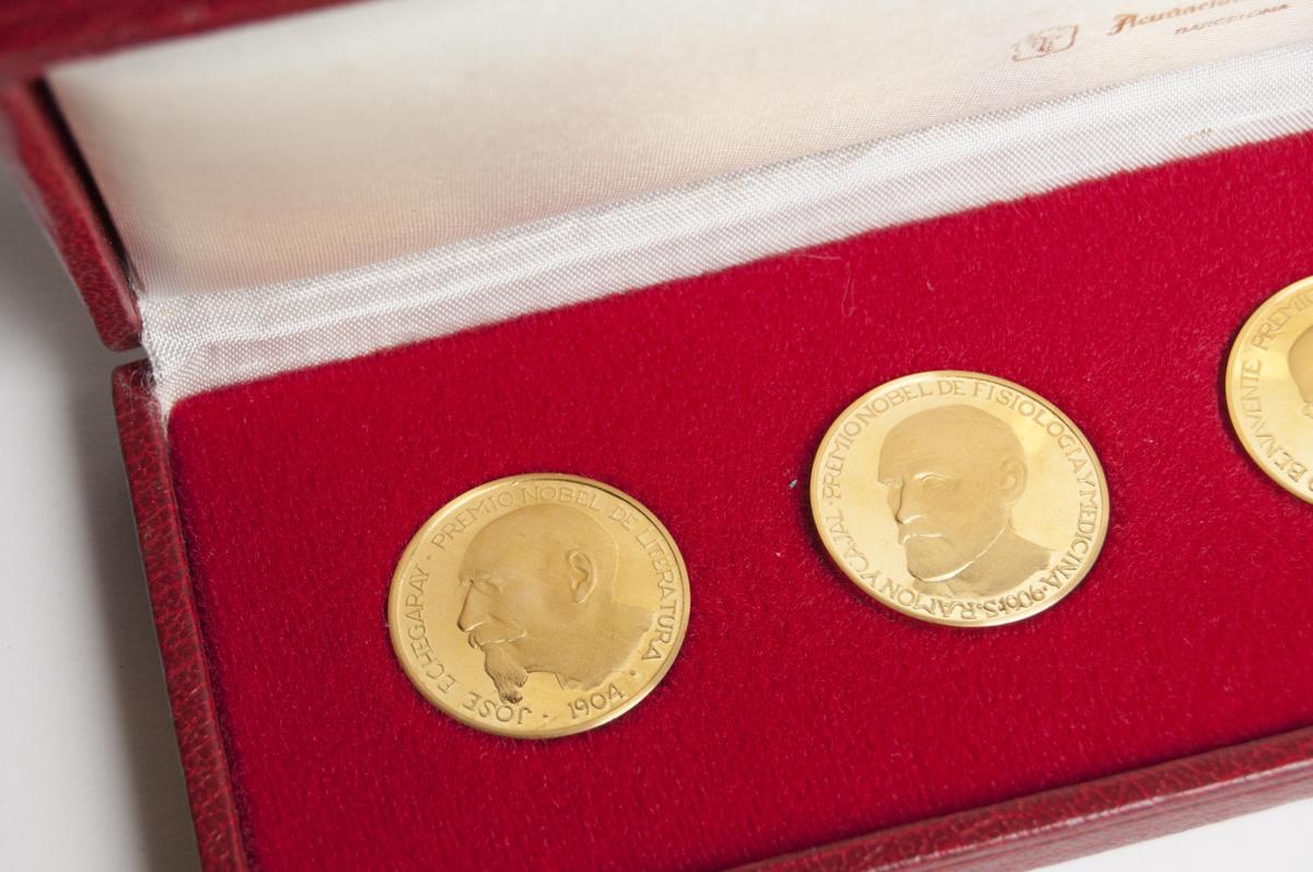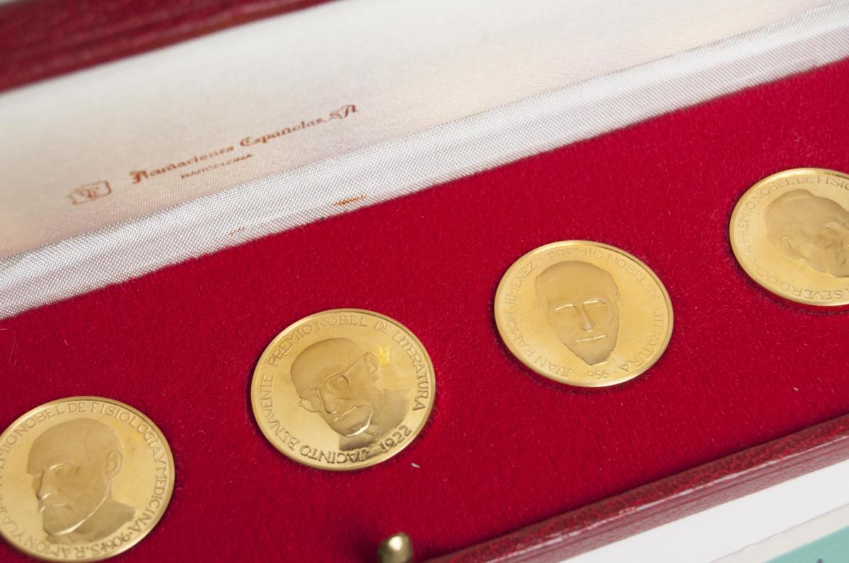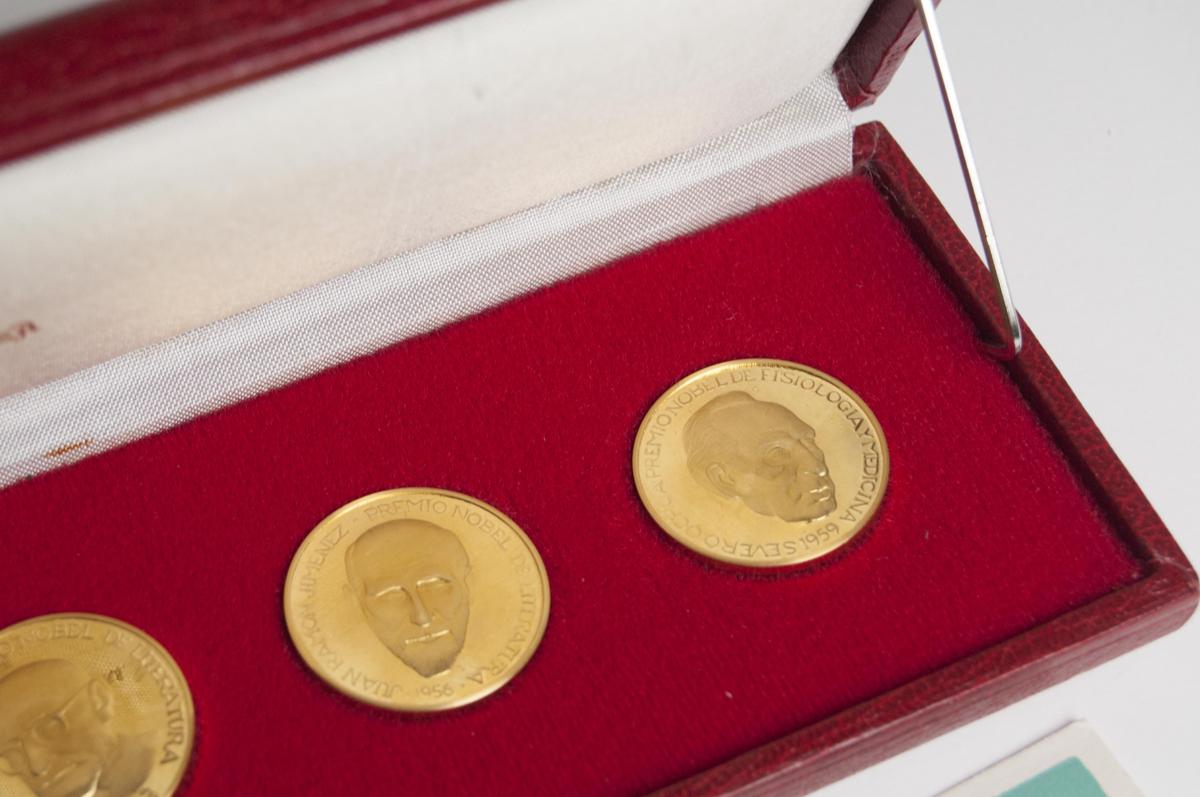 PREMIOS NOBEL. Colección de 5 Medallas de los siguientes Premios Nobel: José Echegaray 1904; Ramón y Cajal 1906; Jacinto Benavente 1922; Juan Ramón Jiménez 1956 y Severo Ochoa 1959. Au. Peso total del conjunto 53,23g. Presentadas en estuche oficial con certificado. SC.