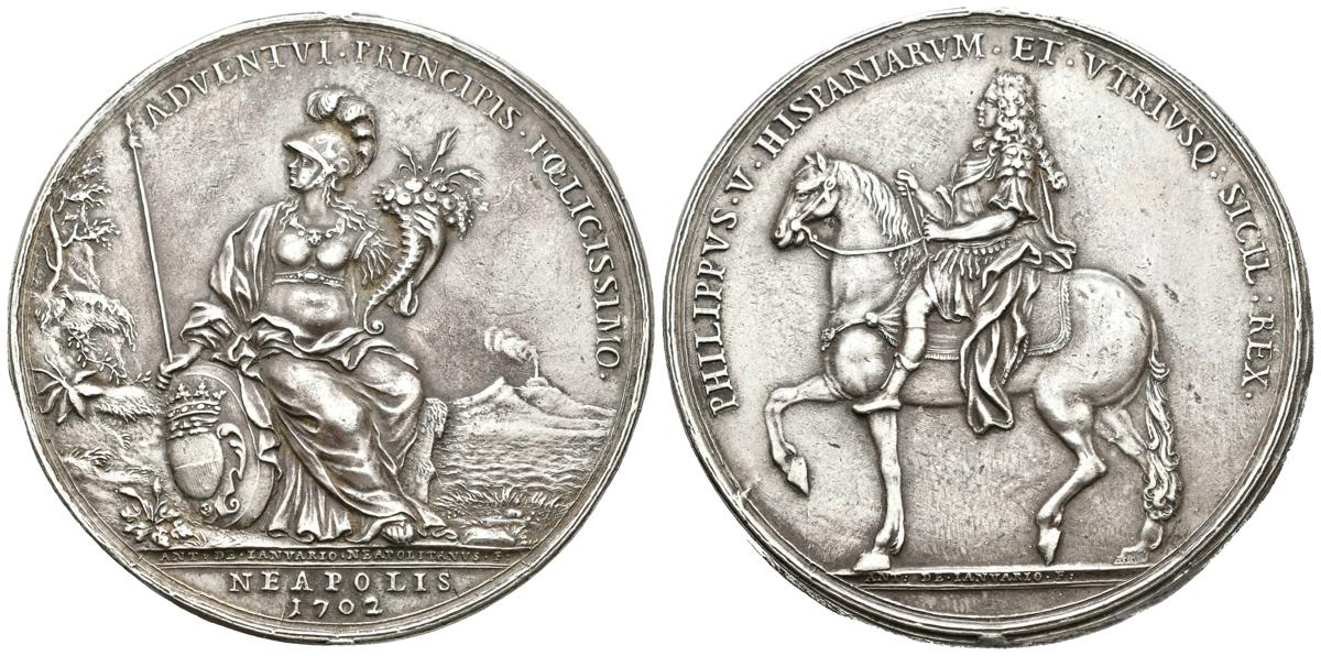 FELIPE V. 1702. Advenimiento al Trono de Felipe V. A/ Felipe V a caballo a la izquierda. Leyenda: PHILIPPVS • V • HISPANIARVM • ET • VTRIVSQ: SICIL : REX •. R/ Figura femenina sentada, sujetando un cuerno de la abundancia con su mano izquierda mientras la derecha la apoya en un escudo y una lanza. Al fondo paisaje de Nápoles con el Vesubio humeante. Leyenda: ADVENTVI • PRINCIPIS • FOELICISSIMO • ; NEAPOLIS/ 1702 en exergo; ANT. DE. IANVARIO. NEAPOLITANVS. F. en el listón que separa el exergo. Ar. 70,08g. 59mm. Plata fundida, posiblemente realizada con posterioridad. EBC-. Rara.