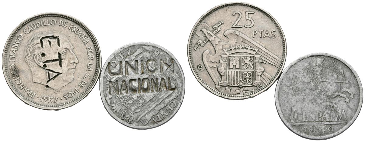 RESELLOS POLITICOS. 10 Céntimos. 1940. Resello UNION NACIONAL y 25 Pesetas. 1957 *59. Marca incisa E.T.A. Al-Cu/Ni. BC+/MBC.