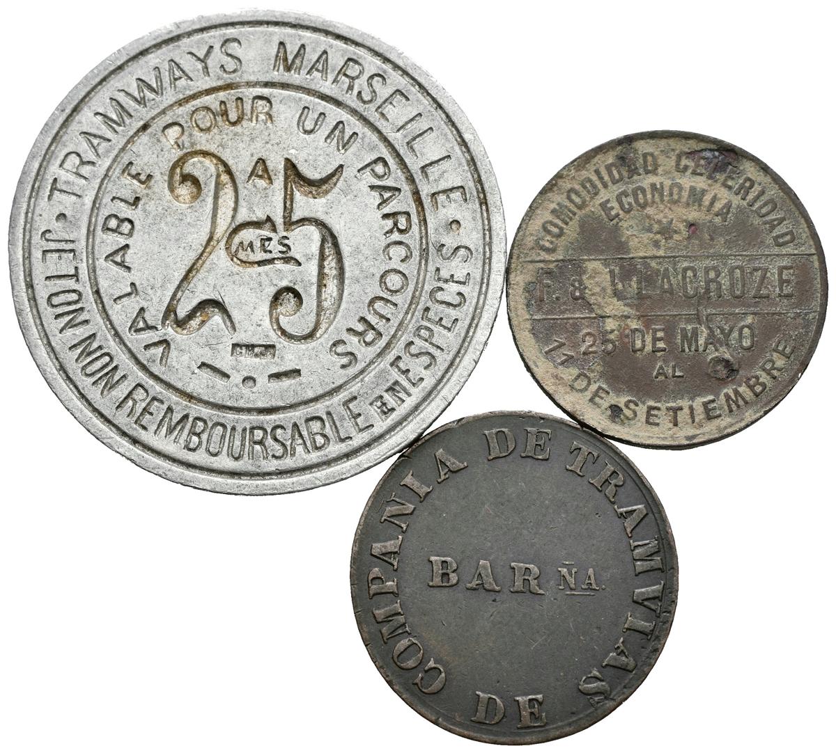 TRANVIAS. Lote compuesto por 3 fichas de tranvías de Barcelona, Marsella, Buenos Aires. Ae-Al. MBC.