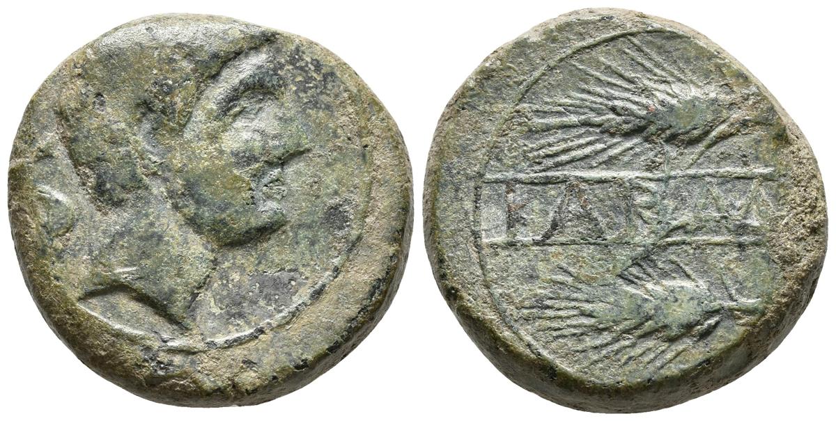 CARMO. As. 80 a.C. Carmona (Sevilla) A/ Cabeza masculina a derecha, detrás delfín. R/ Dos espigas a izquierda, entre ambas KARMO. FAB-461 como semis. Ae. 21,90g. MBC-.