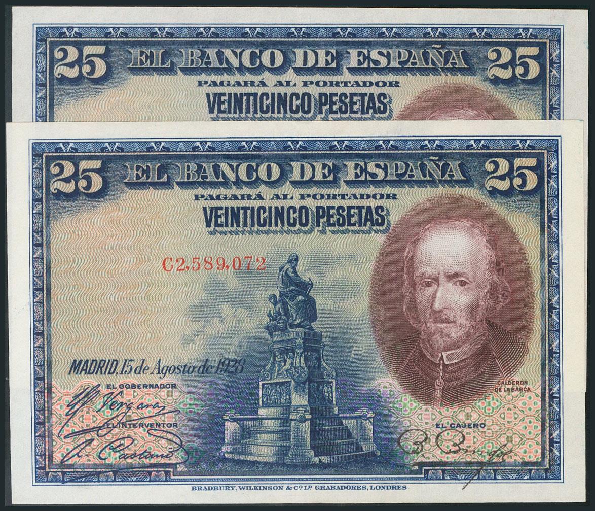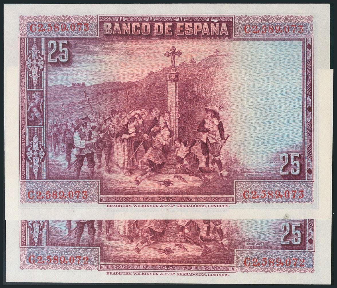 25 Pesetas. 15 de Agosto de 1928. Pareja correlativa. Serie C. Doblez vertical. (Edifil 2017: 353). Apresto original. EBC.