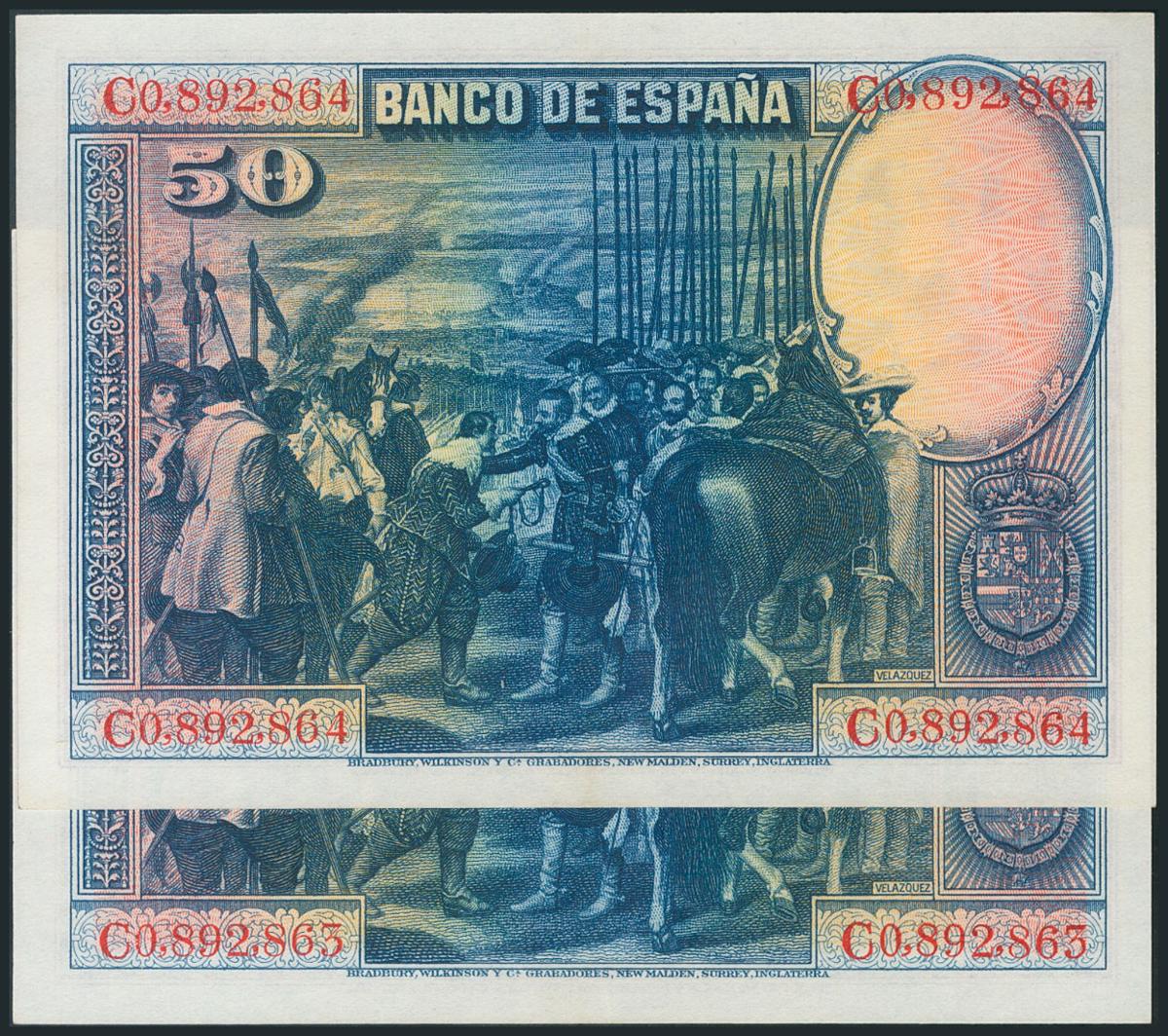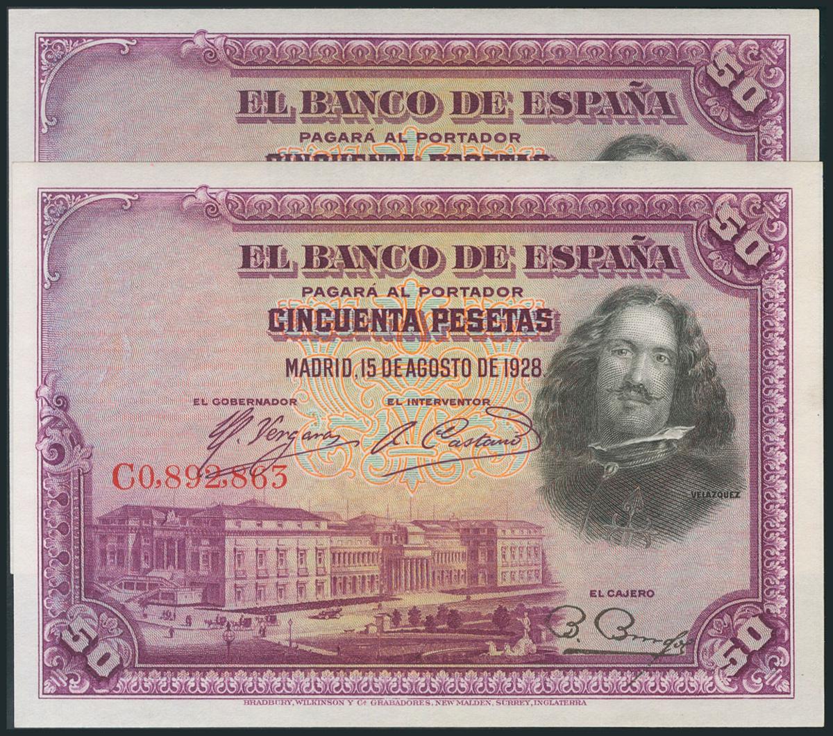50 Pesetas. 15 de Agosto de 1928. Pareja correlativa. Serie C. (Edifil 2017: 354). SC.
