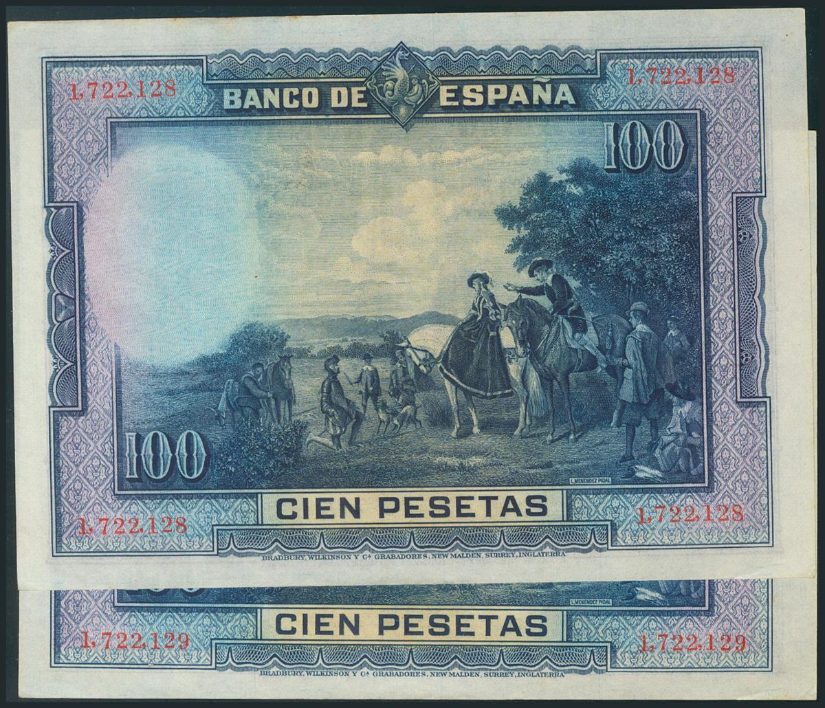 100 Pesetas. 15 de Agosto de 1928. Pareja correlativa. Sin serie. (Edifil 2017: 355). Apresto original, puntitos de óxido. EBC-.