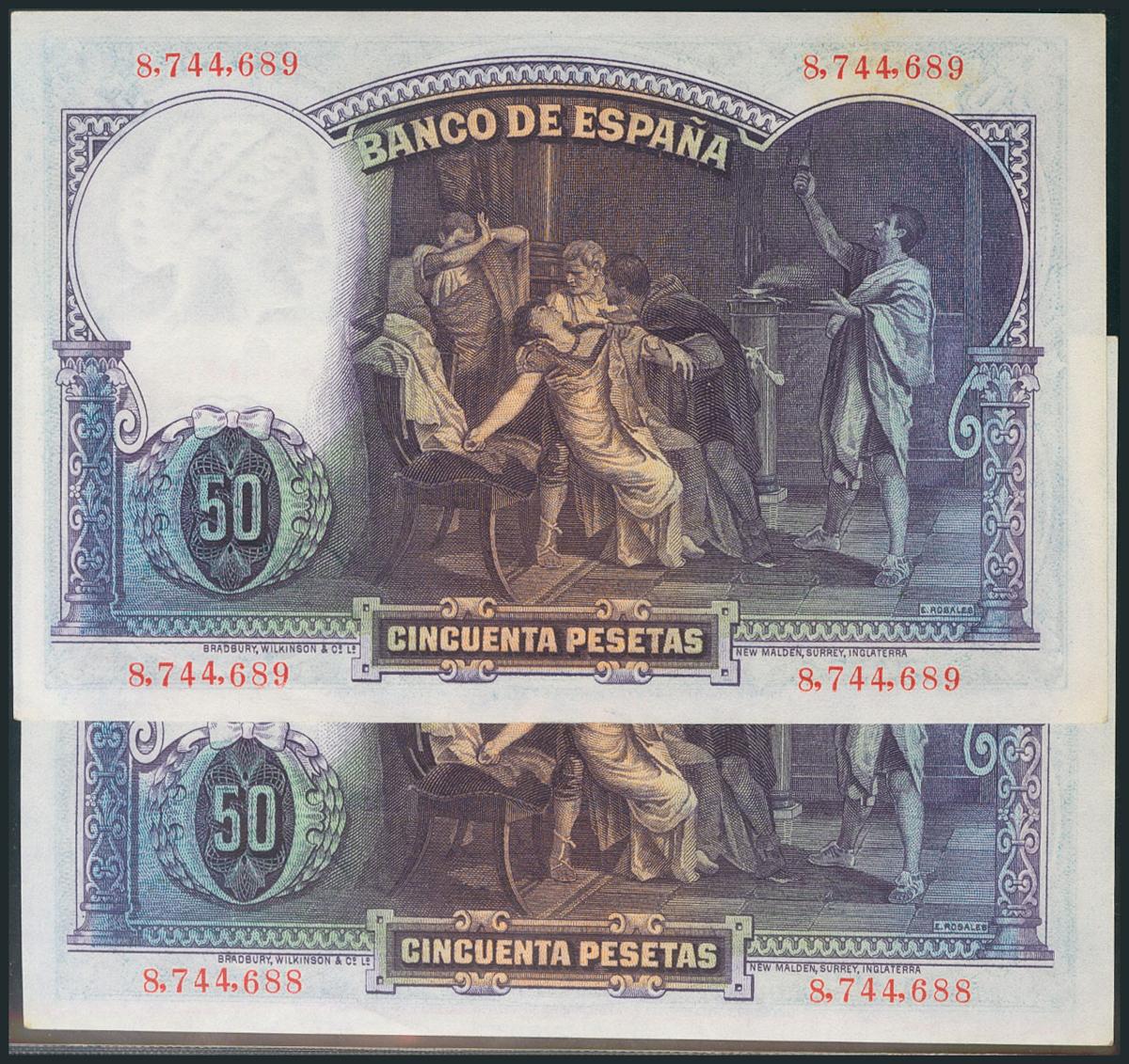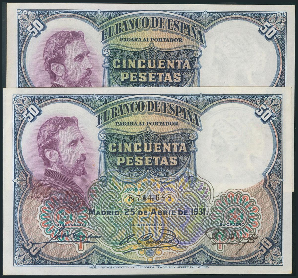 50 Pesetas. 25 de Abril de 1931. Pareja correlativa. Sin serie. (Edifil 2017: 359). Apresto original. EBC.