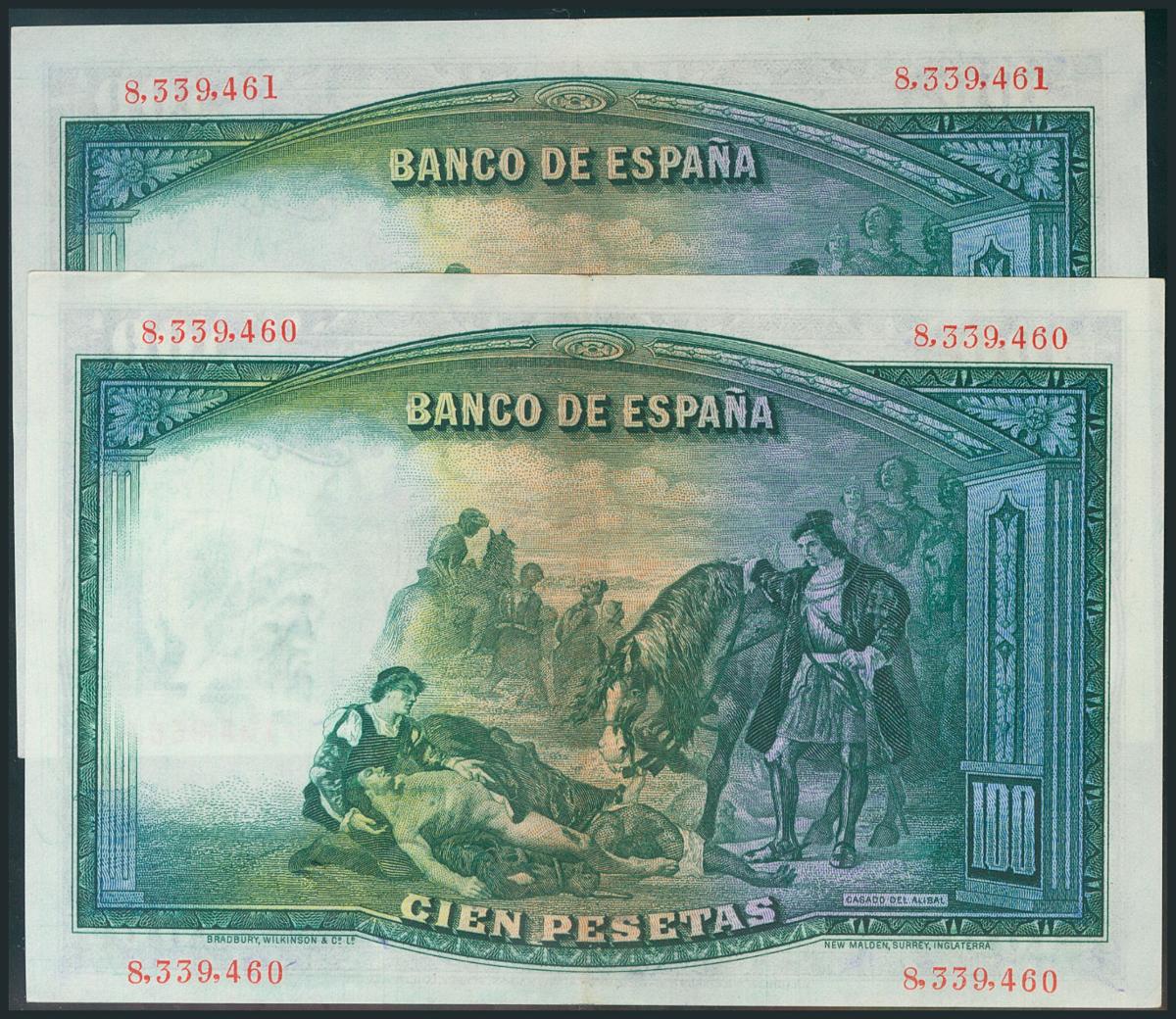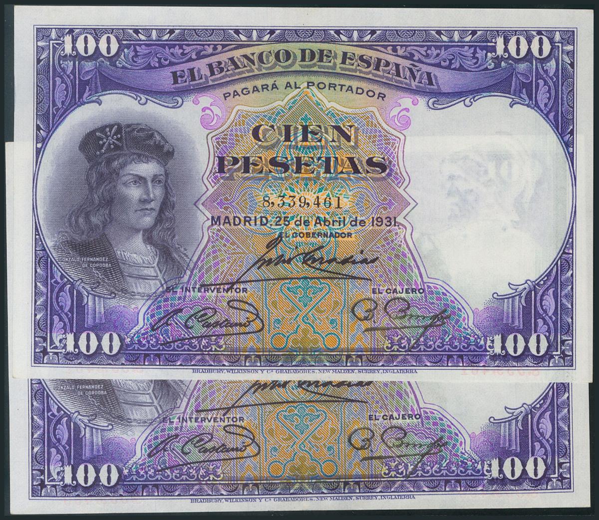100 Pesetas. 25 de Abril de 1931. Pareja correlativa. Sin serie. (Edifil 2017: 360). Apresto original. EBC+.
