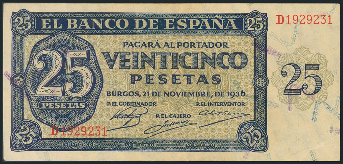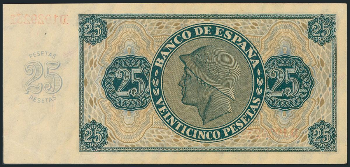 25 Pesetas. 21 de Noviembre de 1936. Banco de España, Burgos. Serie D. (Edifil 2017: 419a). Conserva gran parte del apresto original. EBC.