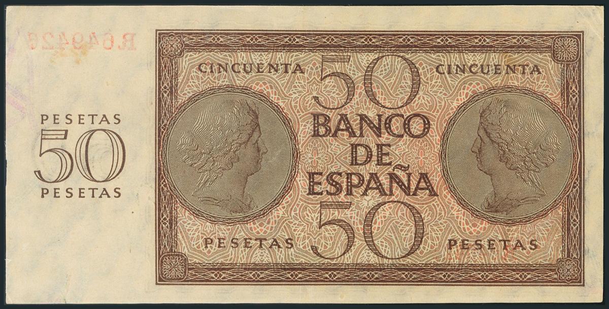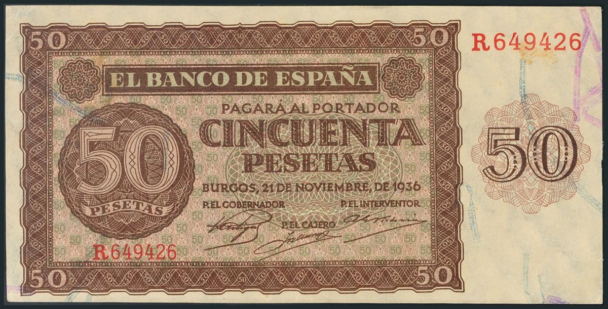 50 Pesetas. 21 de Noviembre de 1936. Banco de España, Burgos. Serie R. (Edifil 2017: 420a). Conserva gran parte del apresto original. EBC.