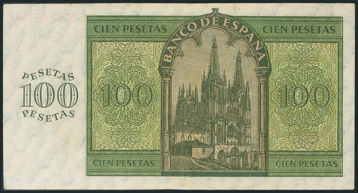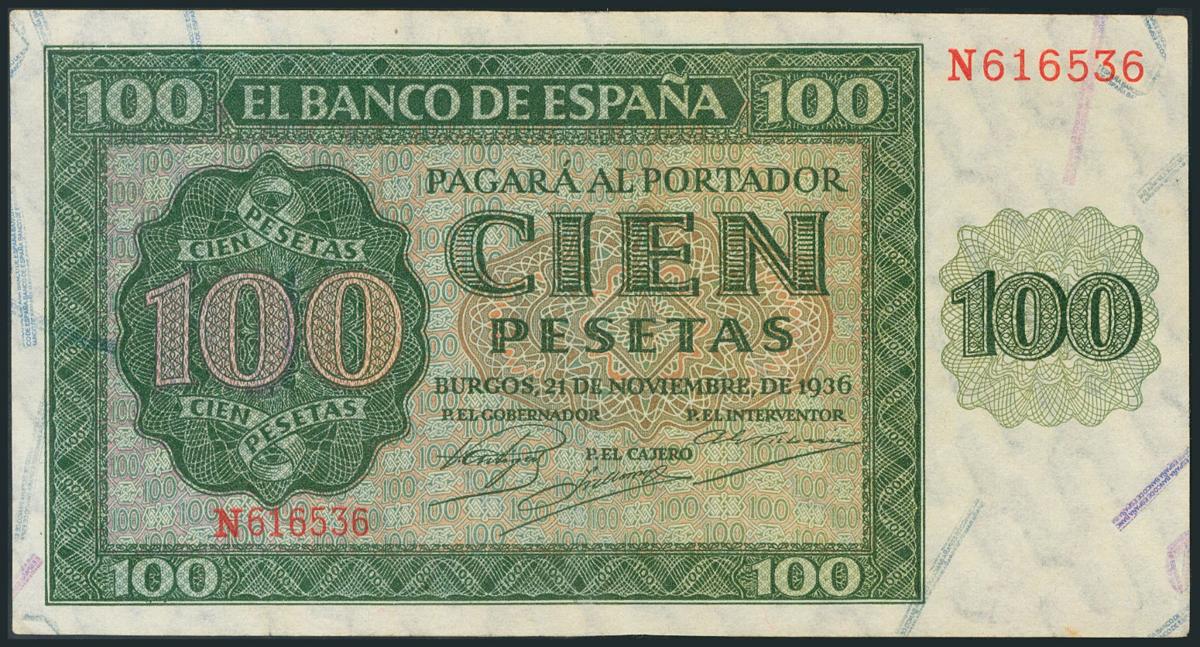 100 Pesetas. 21 de Noviembre de 1936. Banco de España, Burgos. Serie N. Reparado. (Edifil 2017: 421a).