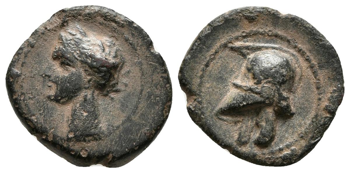 CARTAGONOVA. 1/4 Calco. 225-215 a.C. Cartagena (Murcia). A/ Cabeza de Tanit a izquierda. R/ Casco. FAB-514. Ae. 1,74g. MBC.