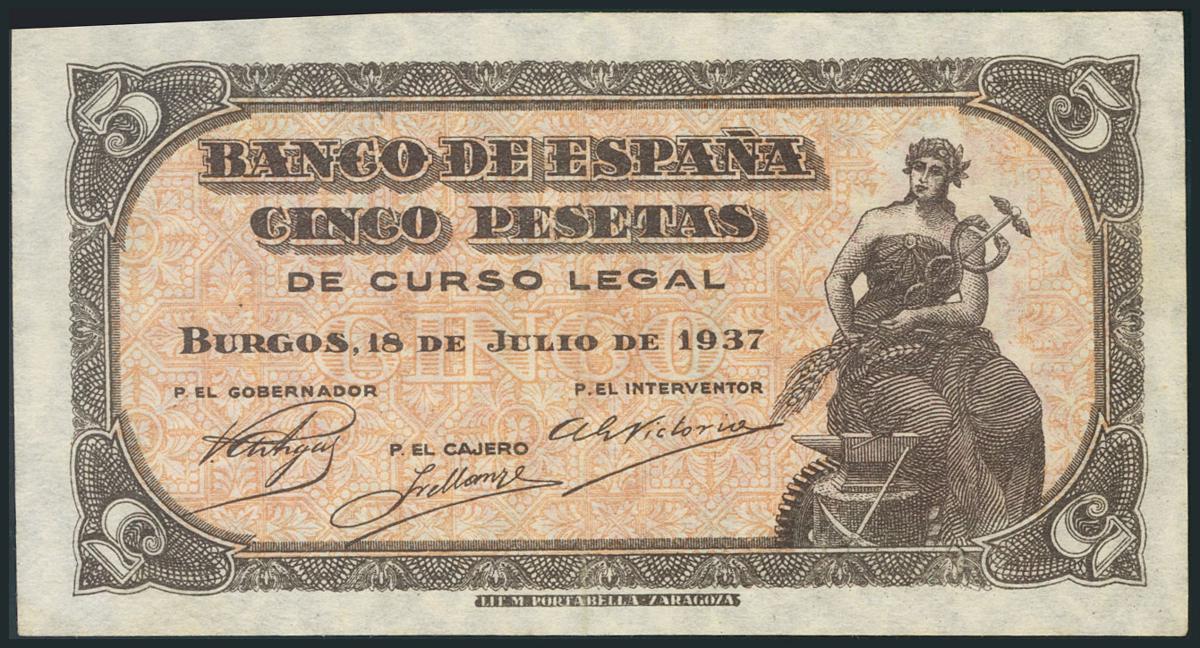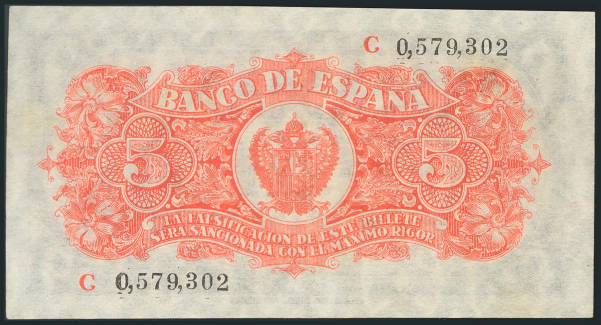 5 Pesetas. 18 de Julio de 1937. Serie C. Doblez vertical. (Edifil 2017: 424a). Conserva gran parte del apresto original. EBC.