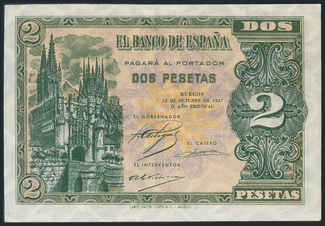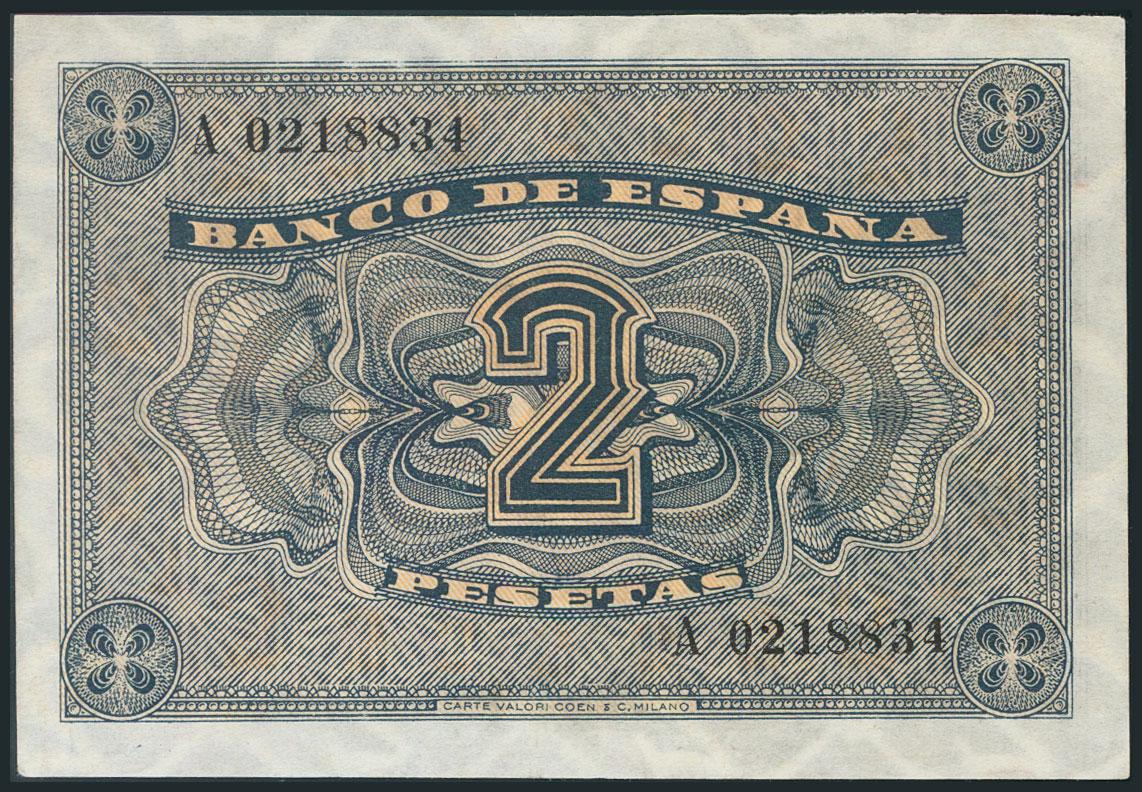 2 Pesetas. 12 de Octubre de 1937. Serie A. Invisible doblez vertical. (Edifil 2017: 426). Apresto original. EBC.