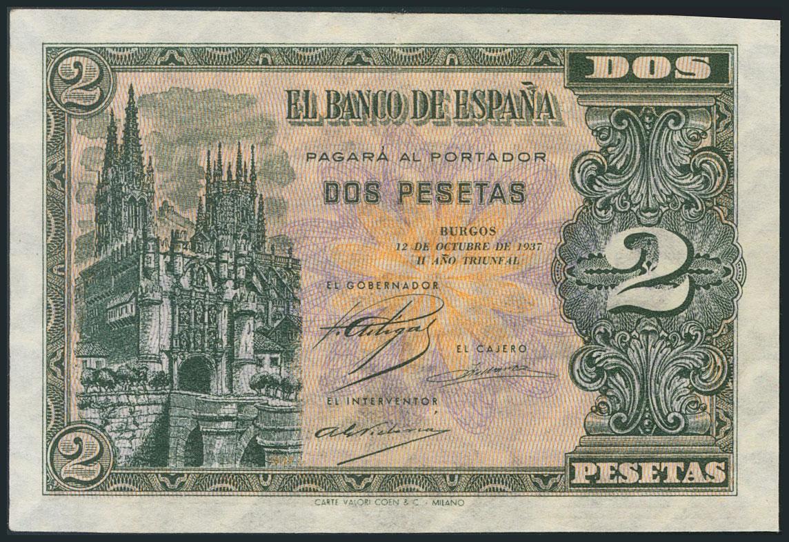 2 Pesetas. 12 de Octubre de 1937. Serie B. (Edifil 2017: 426a). EBC.
