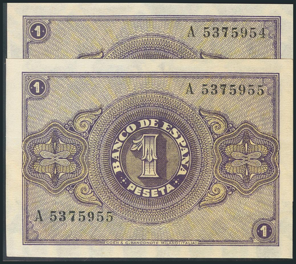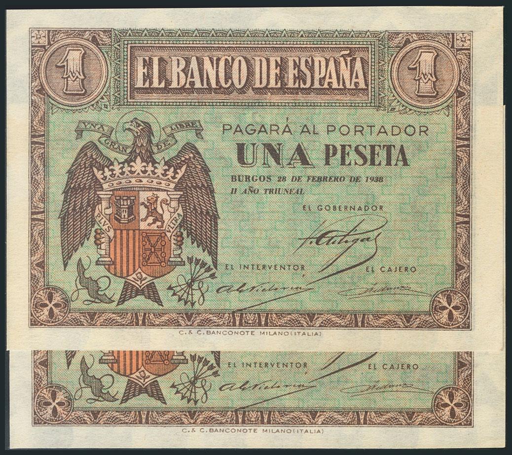 1 Peseta. 28 de Febrero de 1938. Pareja correlativa. Serie A. (Edifil 2017: 427). Apresto original. SC.