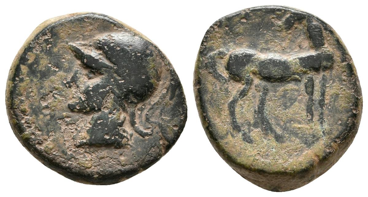 CARTAGONOVA. 1/2 Calco. 220-215 a.C. Cartagena (Murcia). A/ Cabeza de Ares a izquierda. R/ Caballo parado a derecha, con la cabeza vuelta. FAB-517. Ae. 4,67g. MBC. Escasa.
