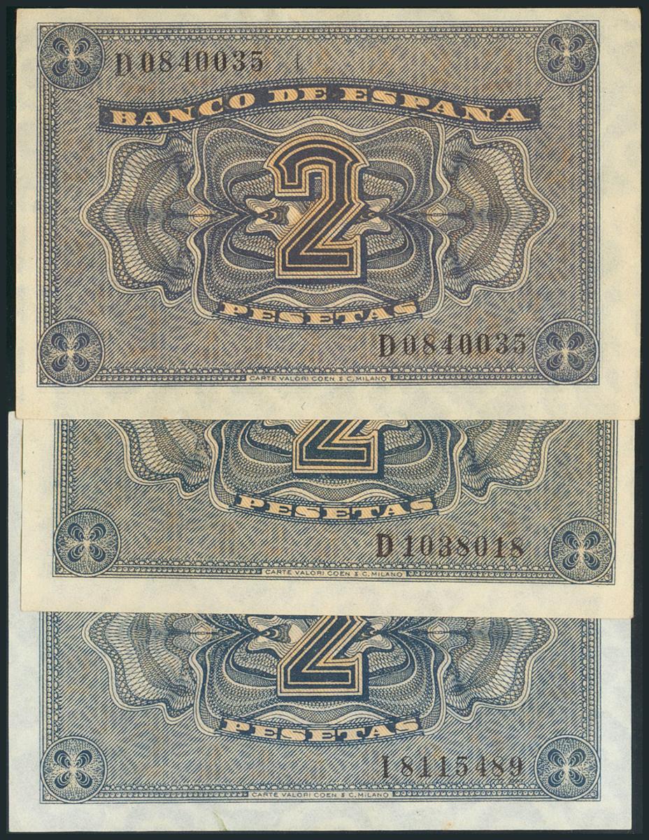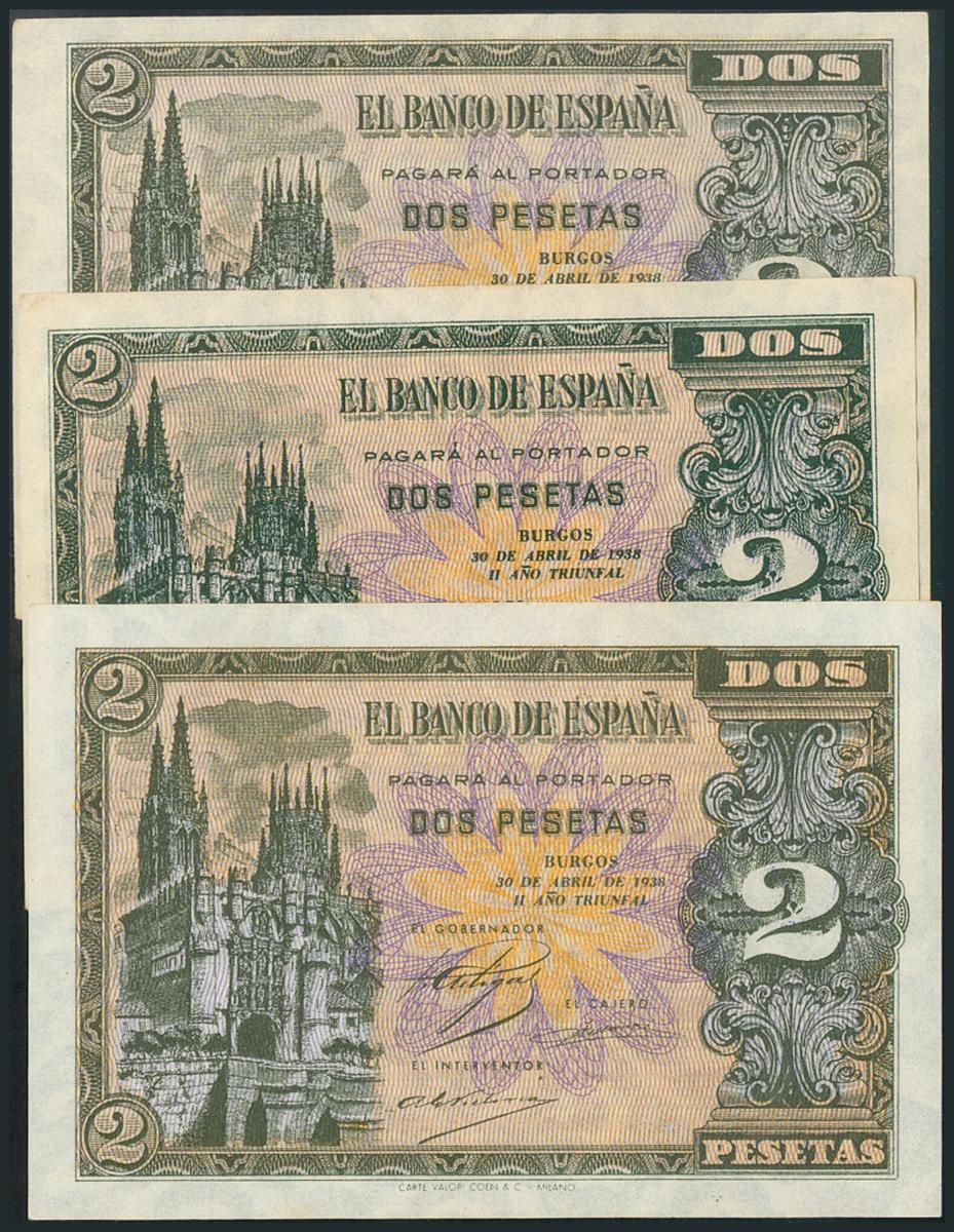 Conjunto de 3 billetes emitidos el 30 de Abril de 1938, serie D (2) y serie I (1) (Edifil 2017: 429, 429a). EBC.