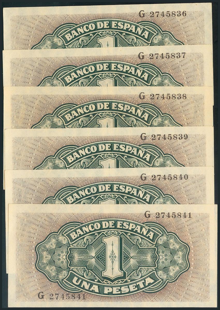 Conjunto de 6 billetes correlativos de 1 Peseta emitidos el 4 de Septiembre de 1940, serie G (Edifil 2017: 442a). SC.