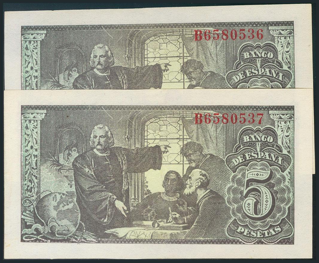 5 Pesetas. 13 de Febrero de 1943. Pareja correlativa. Serie B. (Edifil 2017: 446a). SC.