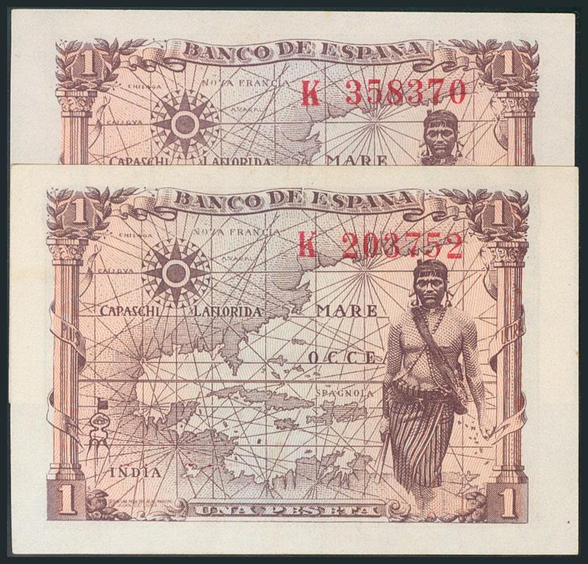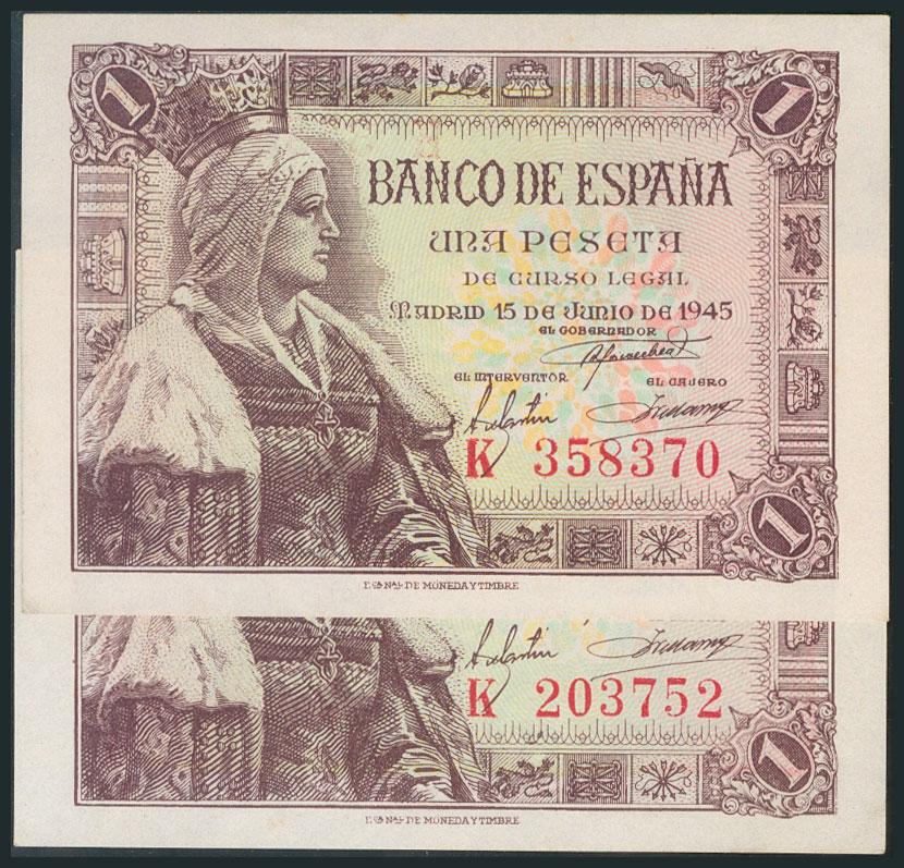 Conjunto de 2 billetes de 1 Peseta emitidos el 15 de Junio de 1945, ambos de la serie K. (Edifil 2017: 448a). EBC+.