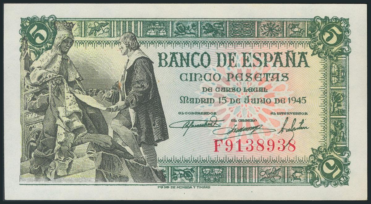5 Pesetas. 15 de Junio de 1945. Serie G. (Edifil 2017: 449a). SC.