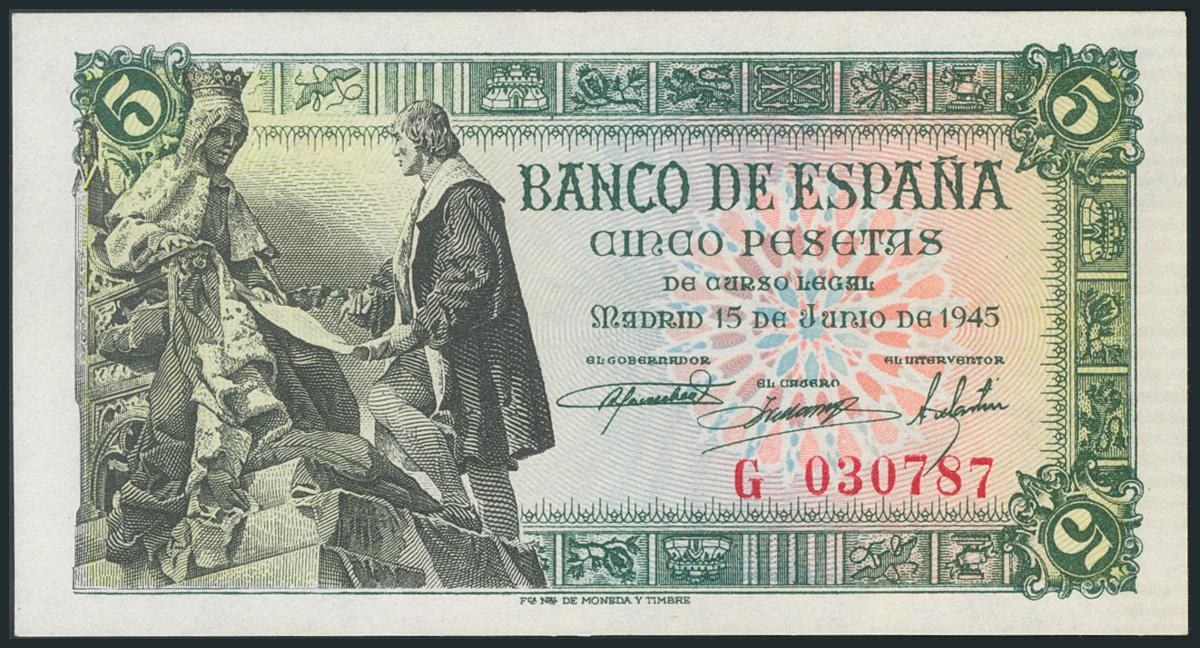 5 Pesetas. 15 de Junio de 1945. Serie G. (Edifil 2017: 449a). SC.