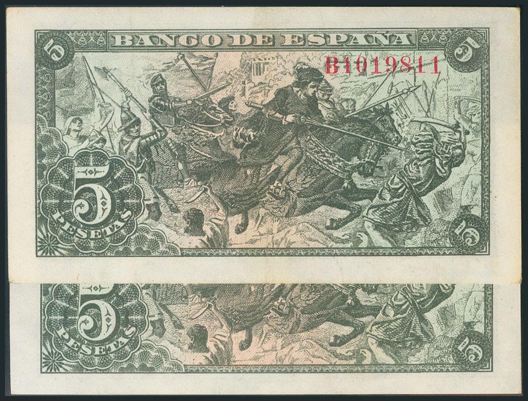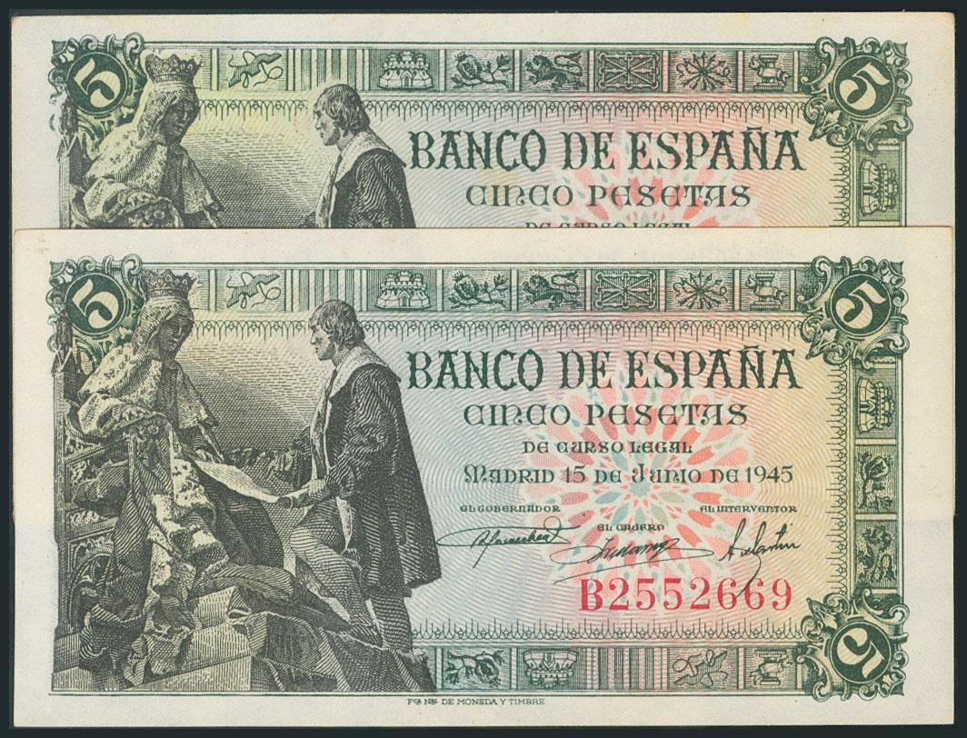 5 Pesetas. 15 de Junio de 1945. Serie B. Pareja correlativa. (Edifil 2017: 449a). EBC/EBC+.