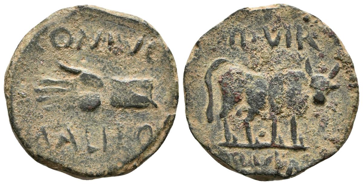 CARTAGONOVA. Semis. Epoca de Augusto. 27 a.C.-14 d.C. Cartagena (Murcia). A/ Mano a izquierda. CONDVC. MALLEOL. R/ Toro a derecha. II VIR. QVINQ. FAB-579. Ae. 5,21g. MBC+.