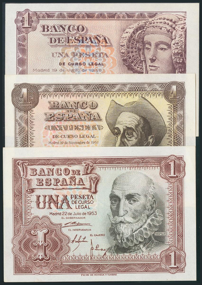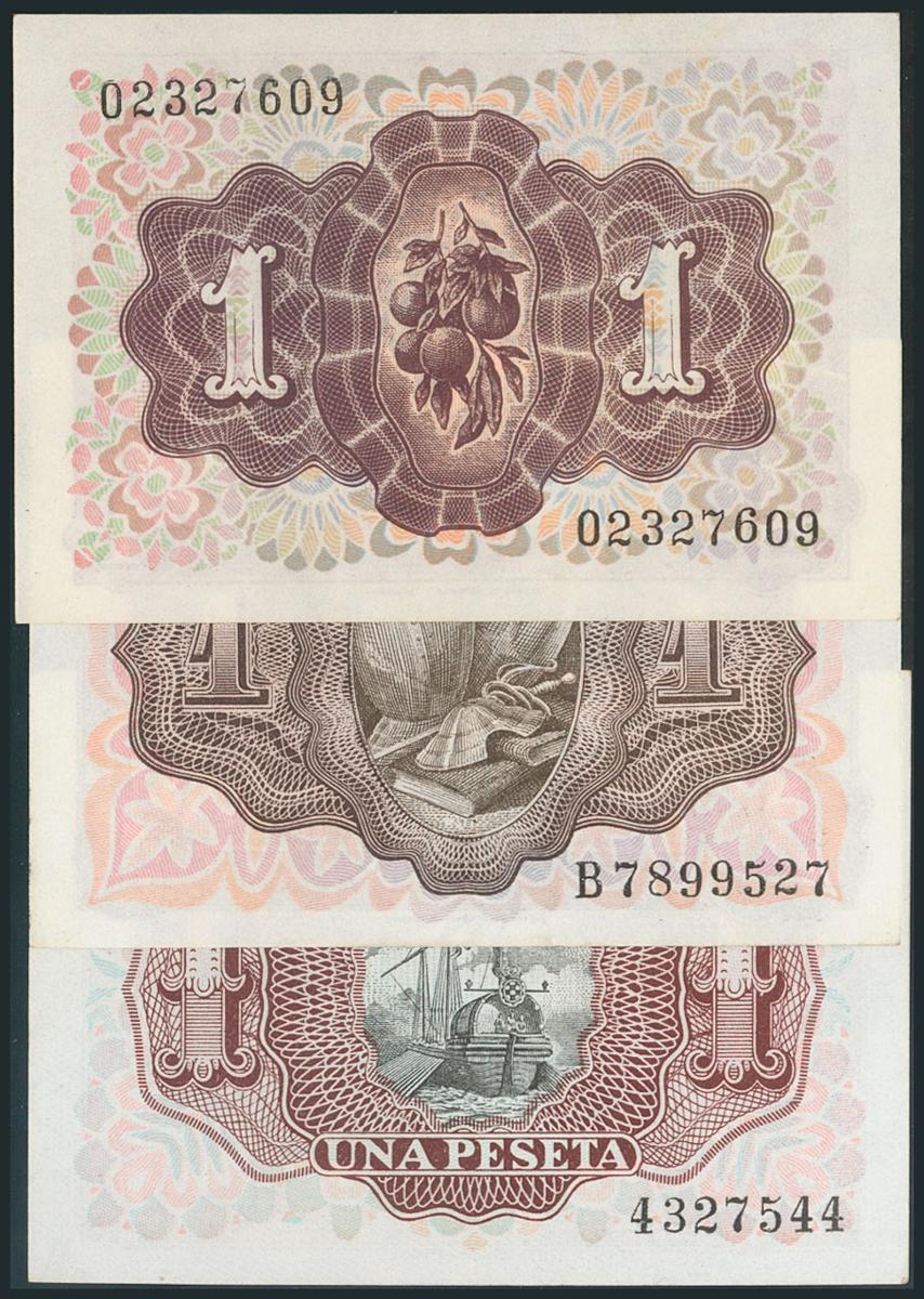 Conjunto de 3 billetes de 1 Peseta emitidos el 19 de Junio de 1948, sin serie, el 19 de Noviembre de 1951, serie B y el 22 de Julio de 1953, sin serie (Edifil 2017: 457, 461a, 465). SC.