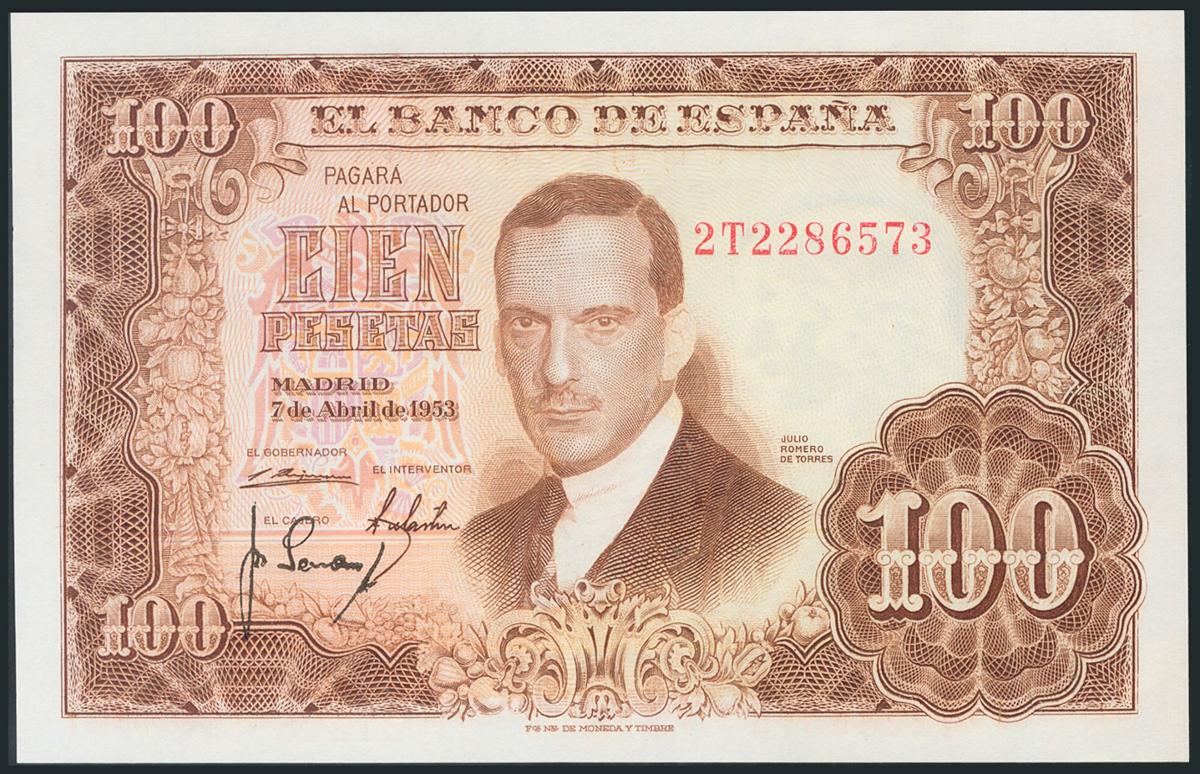 100 Pesetas. 7 de Abril de 1953. Serie 2T. (Edifil 2017: 464c). SC.