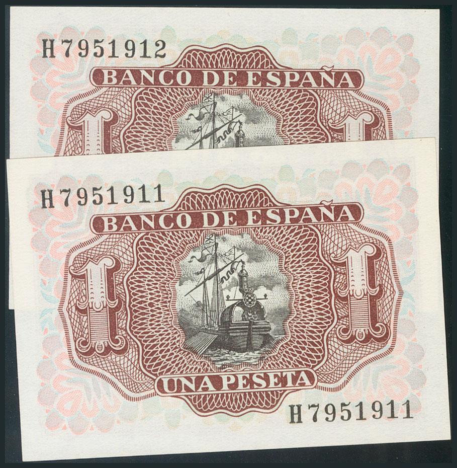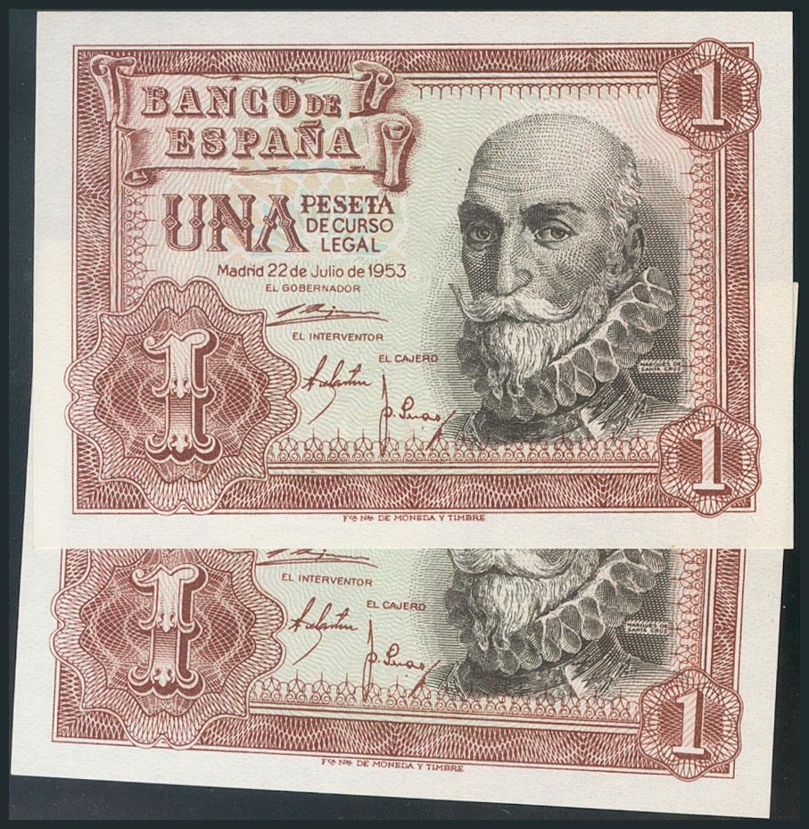 1 Peseta. 22 de Julio de 1953. Pareja correlativa. Serie T. (Edifil 2017: 465a). SC.