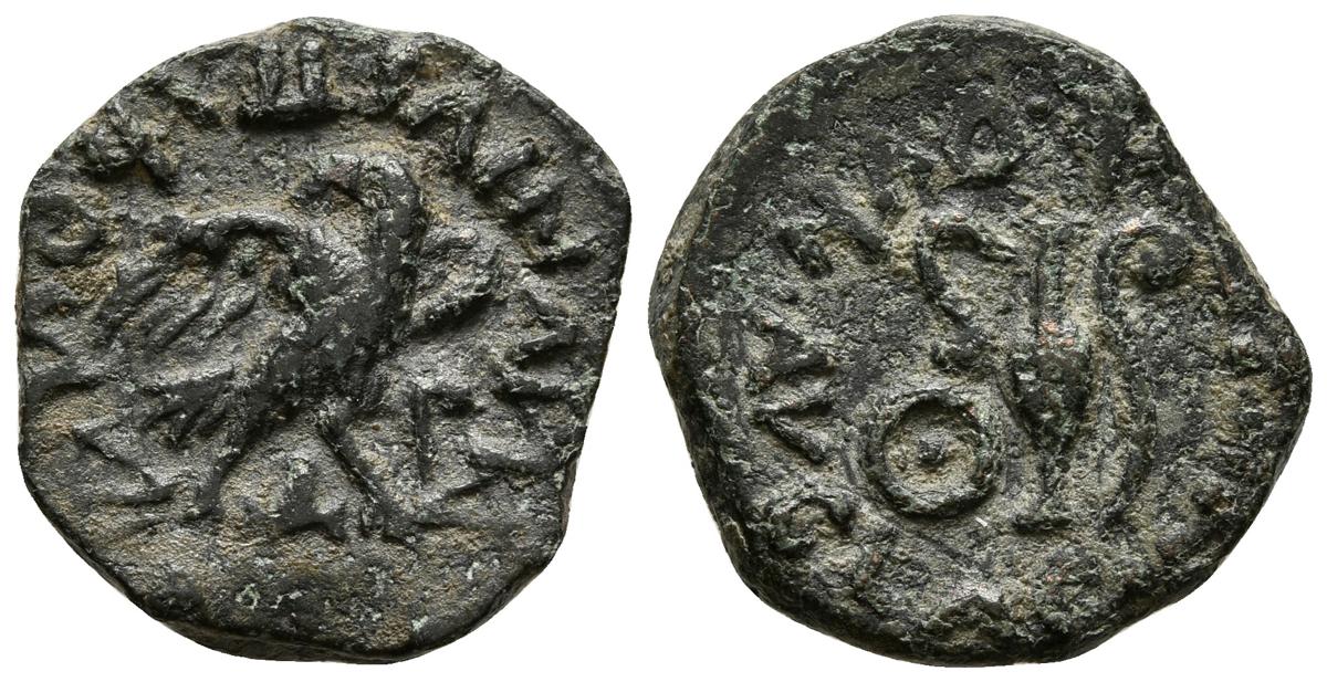 CARTAGONOVA. Semis. Epoca de Augusto. 27 a.C.-14 d.C. Cartagena (Murcia). A/ Aguila sobre rayos, alrededor L. IVNIVS II. VIR. QVINQ. AVG. R/ Objetos ceremoniales, alrededor L. ACILIVS II. VIR. QVINQ. AVG. FAB-583. Ae. 6,02g. MBC+.