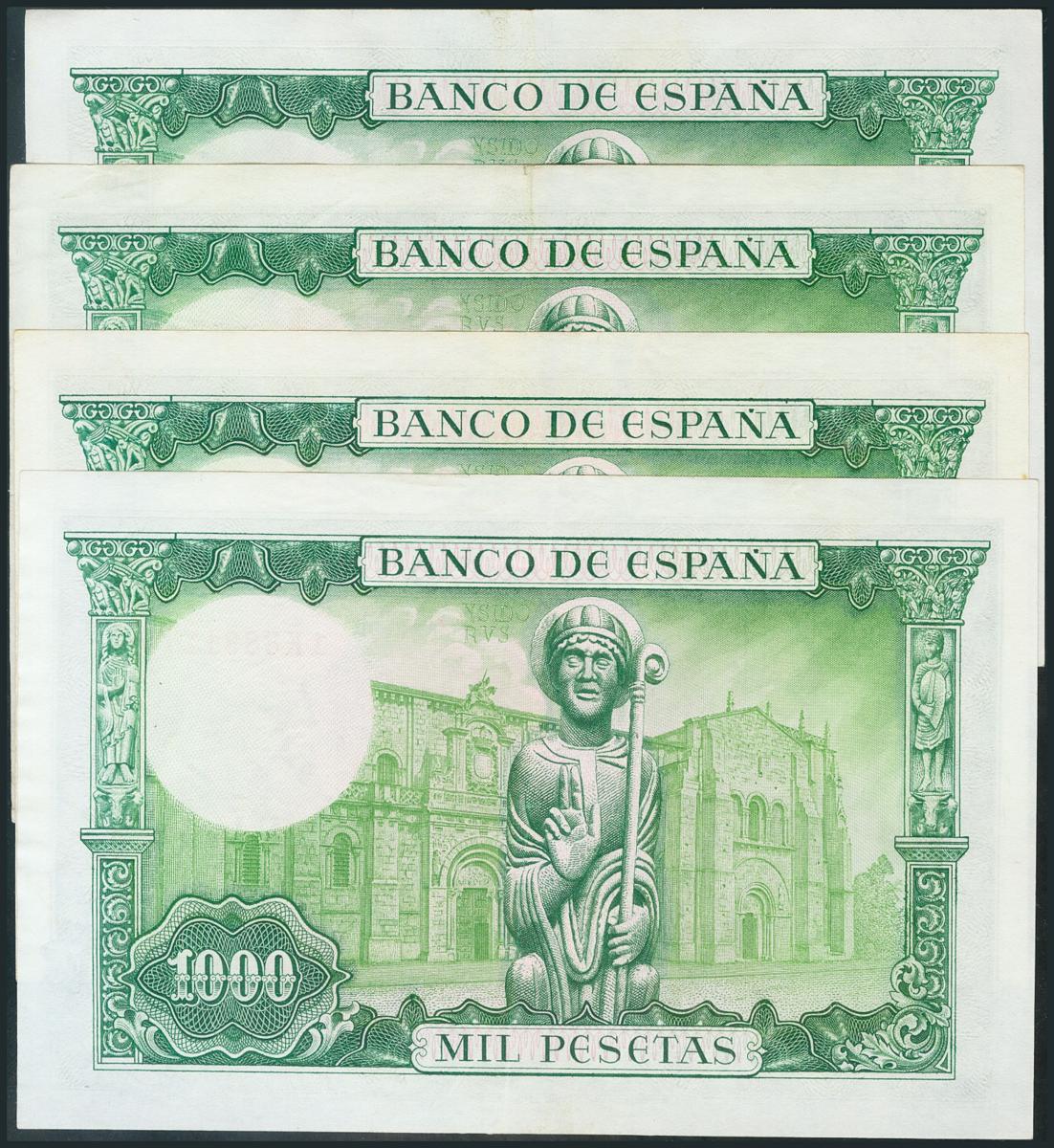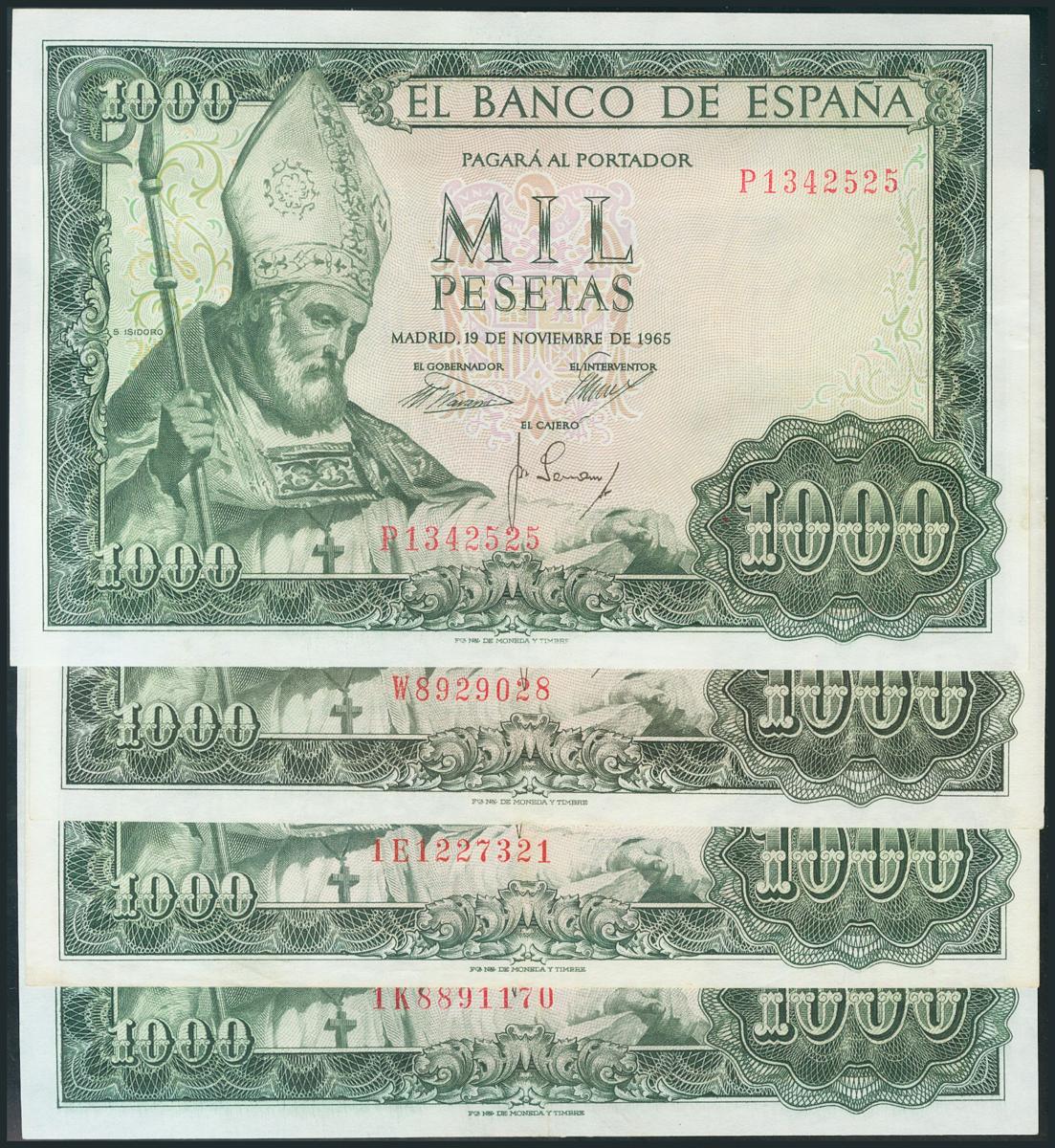Conjunto de 4 billetes de 1000 Pesetas emitidos el 19 de Noviembre de 1965, series P, W, 1E y 1K (Edifil 2017: 471b). EBC+/-.