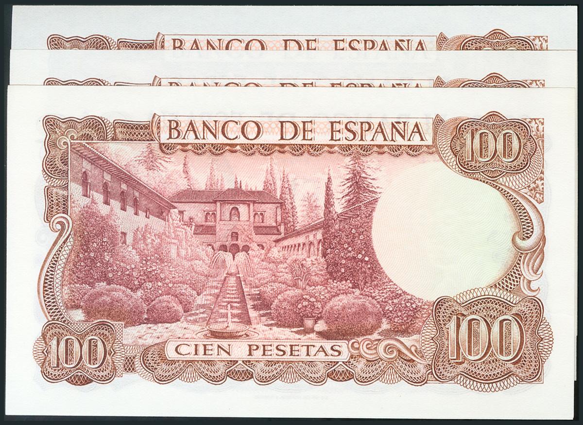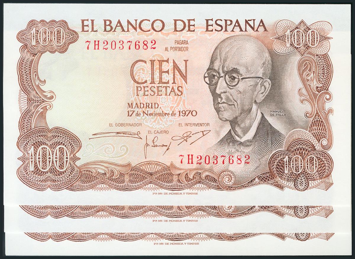 100 Pesetas. 17 de Noviembre de 1970. Cinco billetes correlativos. Serie 7H. (Edifil 2017: 472c). SC.