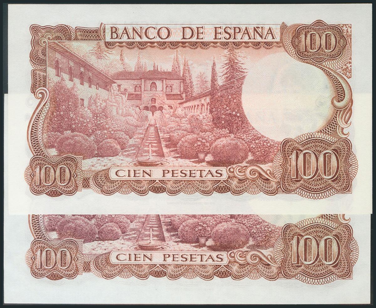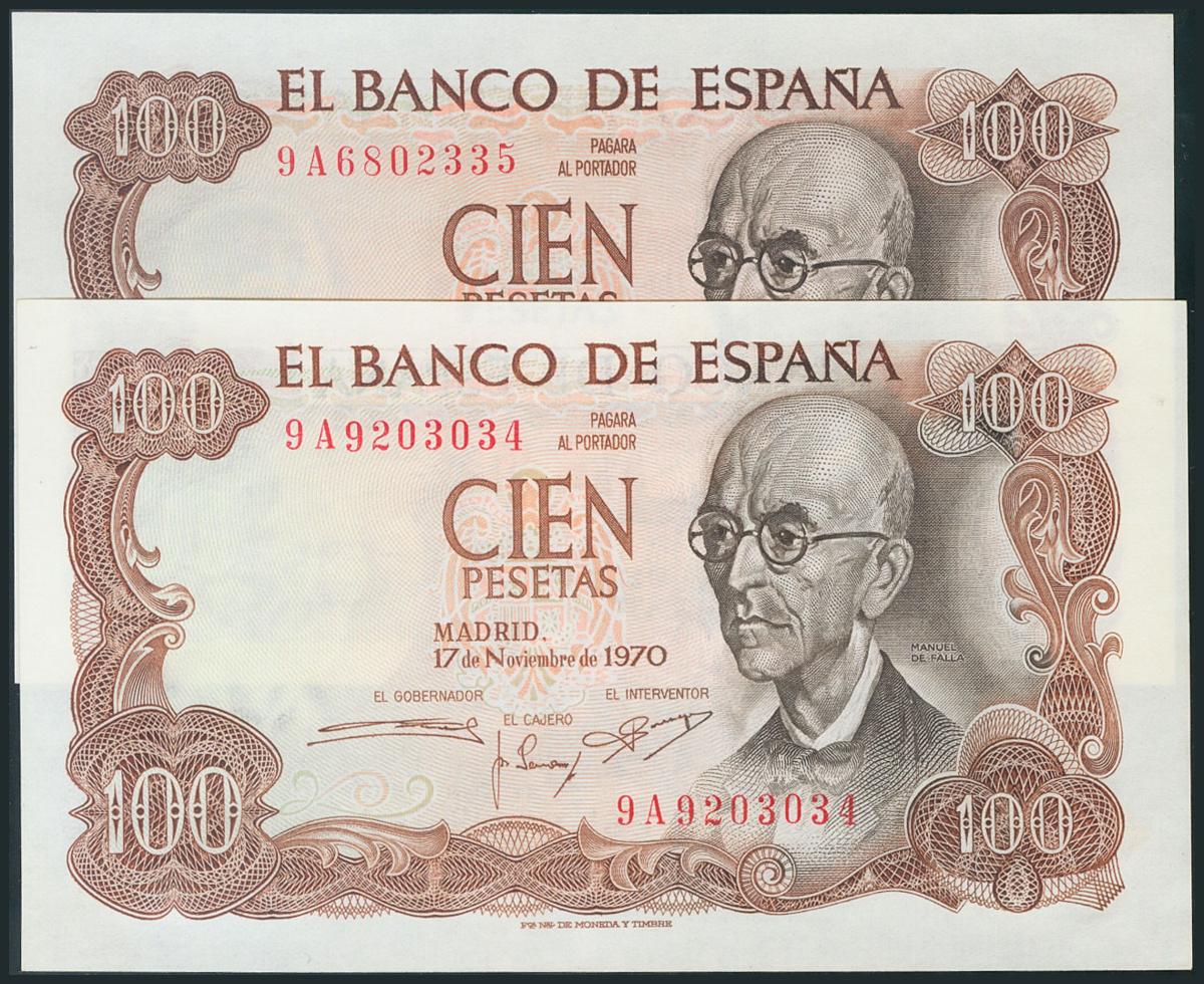 100 Pesetas. 17 de Noviembre de 1970. Pareja correlativa. Serie 9A. (Edifil 2017: 472d). SC.