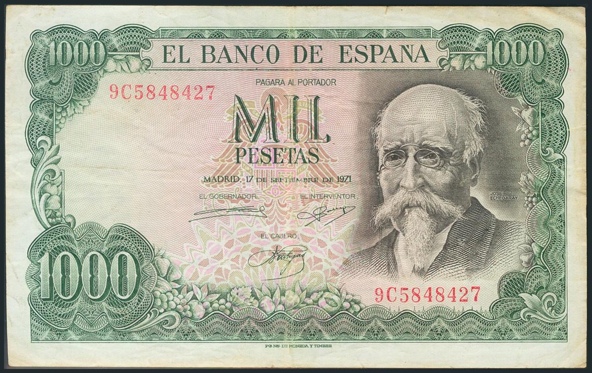 1000 Pesetas. 17 de Septiembre de 1971. Serie 9C. (Edifil 2017: 474d). BC.