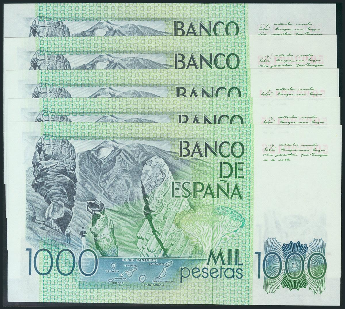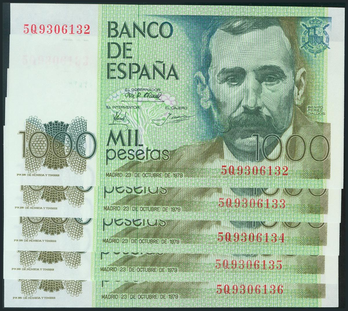 Conjunto de 5 billetes correlativos de 1000 Pesetas emitidos el 23 de Diciembre de 1979, serie 5Q (Edifil 2017: 477a). SC.