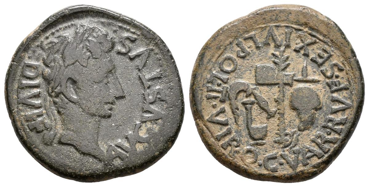 CARTAGONOVA. Semis. Epoca de Augusto. 27 a.C.-14 d.C. Cartagena (Murcia). A/ Cabeza laureada de Augusto a derecha. AVGVSTVS DIVI F. R/ Aspérgilo, símpulo, segur y ápex. C. VAR. RVF. SEX. IVL. POL. II VIR. Q. FAB-594. Ae. 8,46g. MBC+.