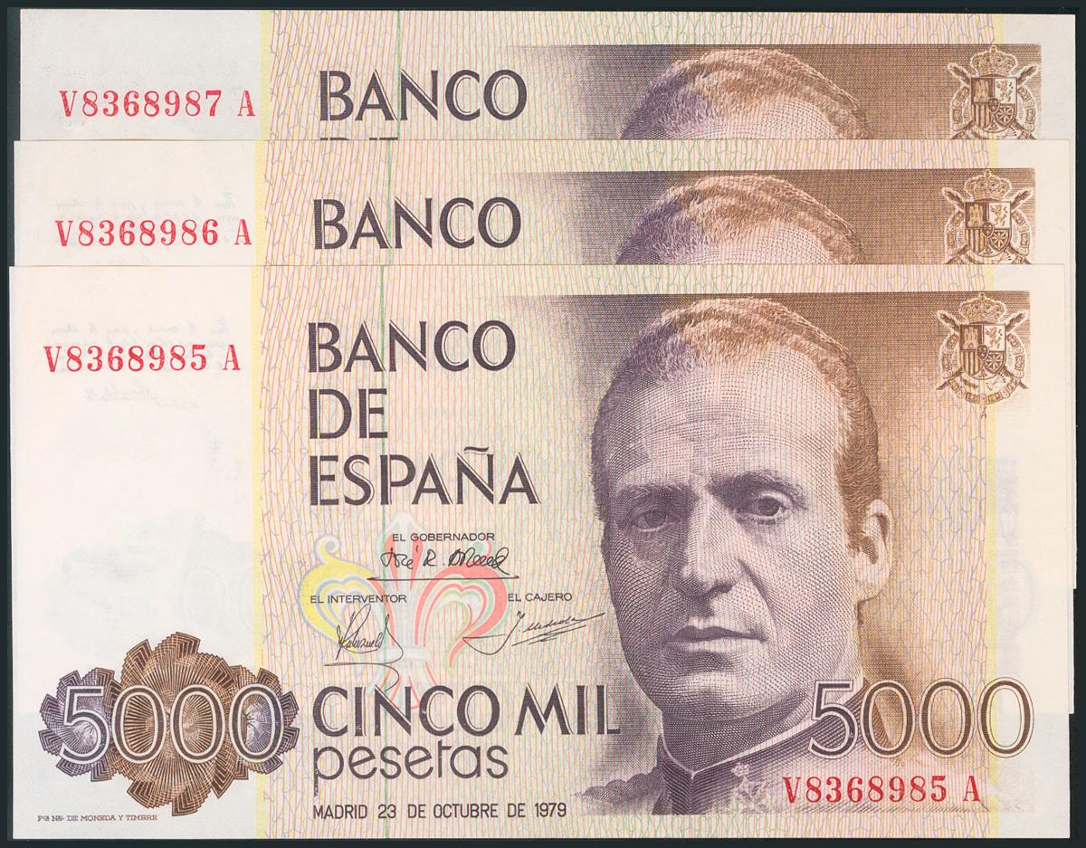 5000 Pesetas. 23 de Diciembre de 1979. Trío correlativo. Serie T. (Edifil 2017: 478a). SC-.