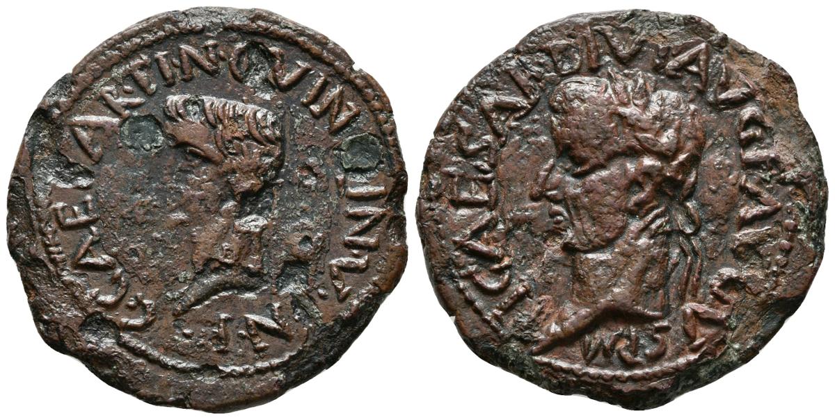 CARTAGONOVA. As. Epoca de Tiberio. 14-36 d.C. Cartagena (Murcia). A/ Cabeza laureada de Tiberio a izquierda. TI. CAESAR DIVI AVG. F. AVGVSTVS. R/ Cabeza de Calígula a izquierda. C. CAESAR TI. N. QVINQ. IN. V. I. N. K. FAB-601. Ae. 11,81g. MBC-.